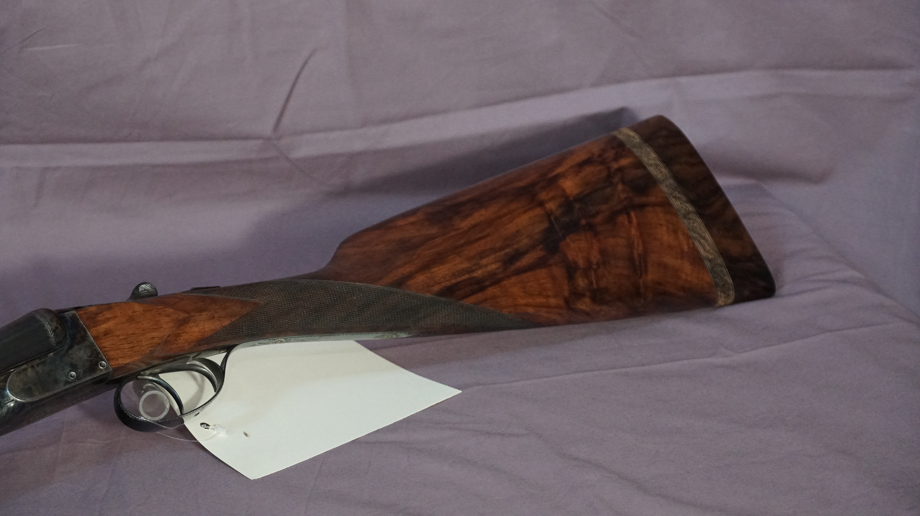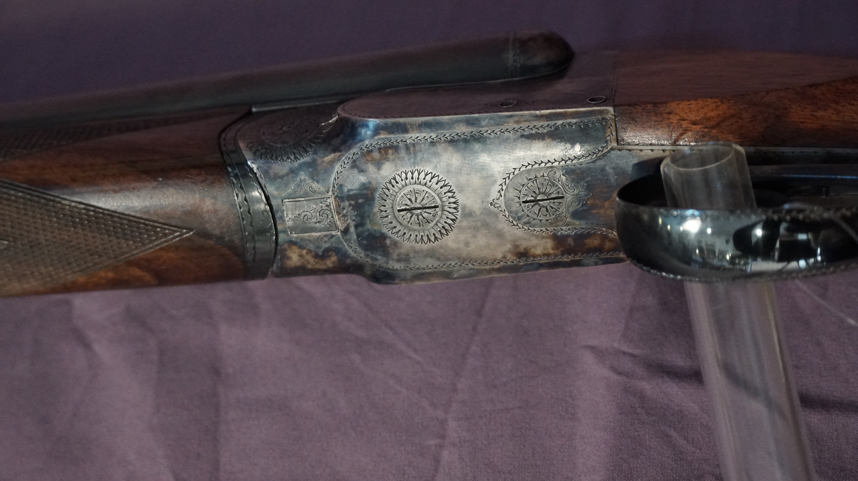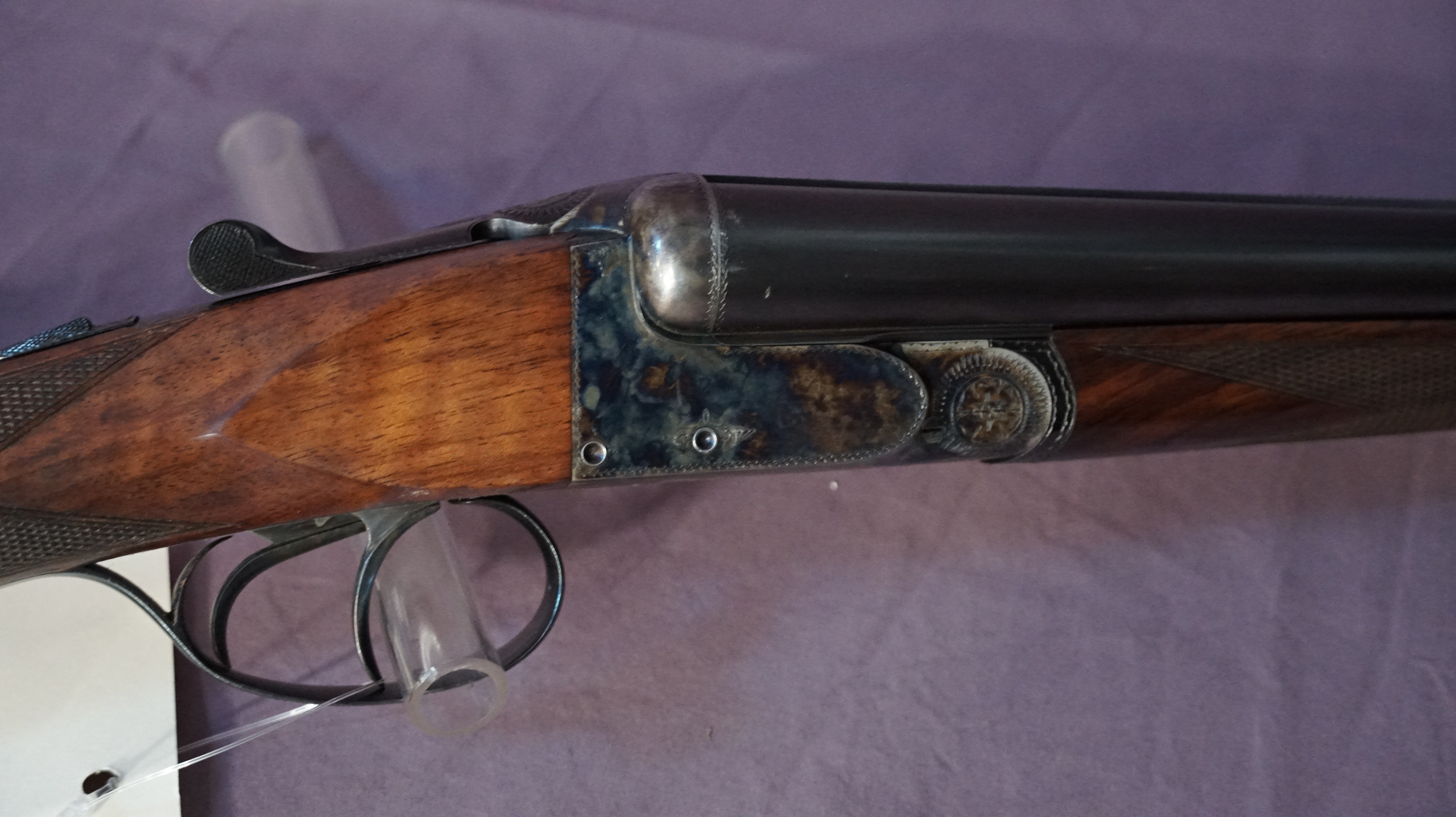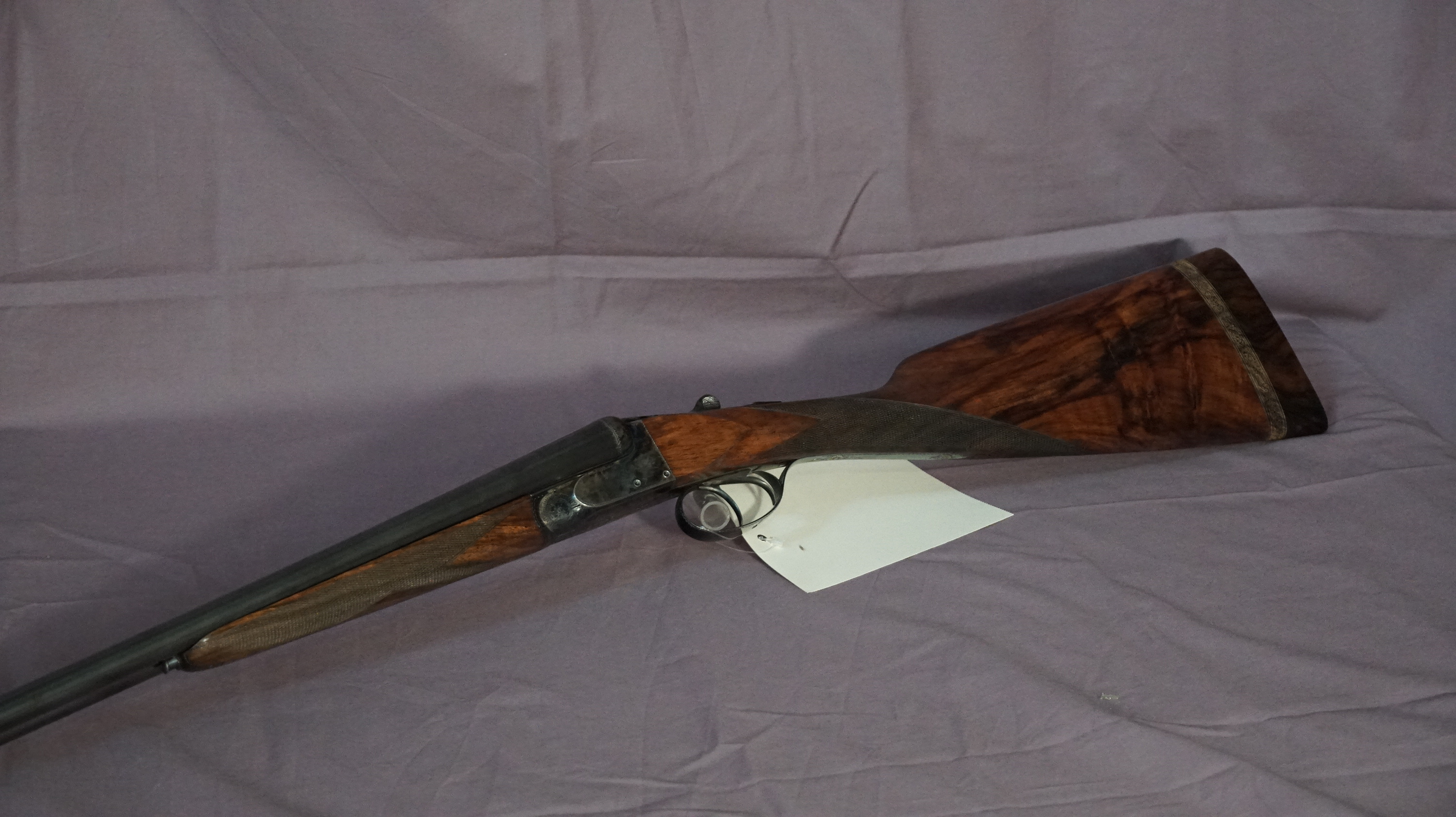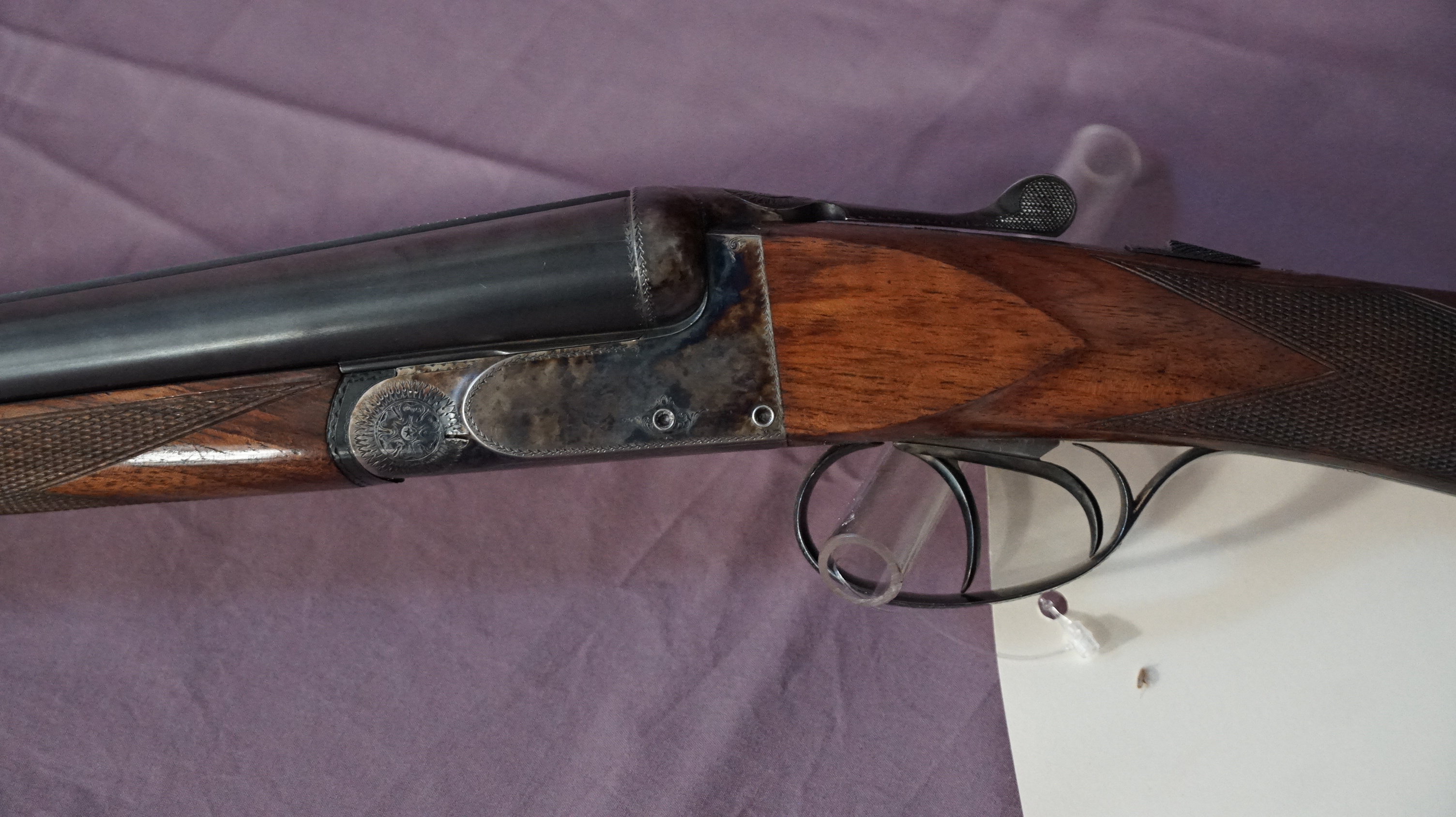 Juxtaposé canons 68cm, chokes lisse amélioré et 1/2, crosse anglaise L 375mm avec rallonge bois 40mm, bascule jaspée avec gravure de rosaces, très bon état, peu servi.