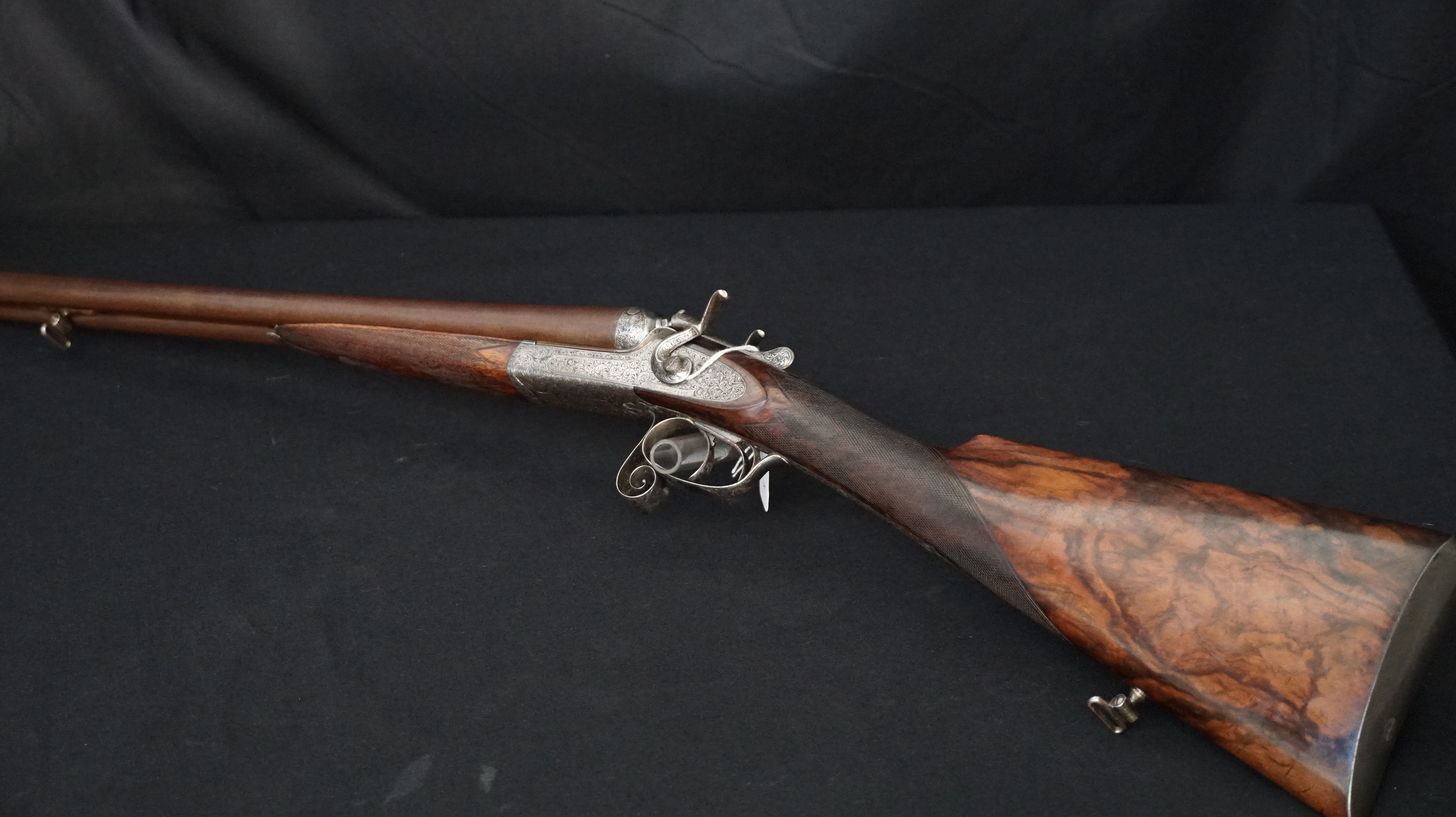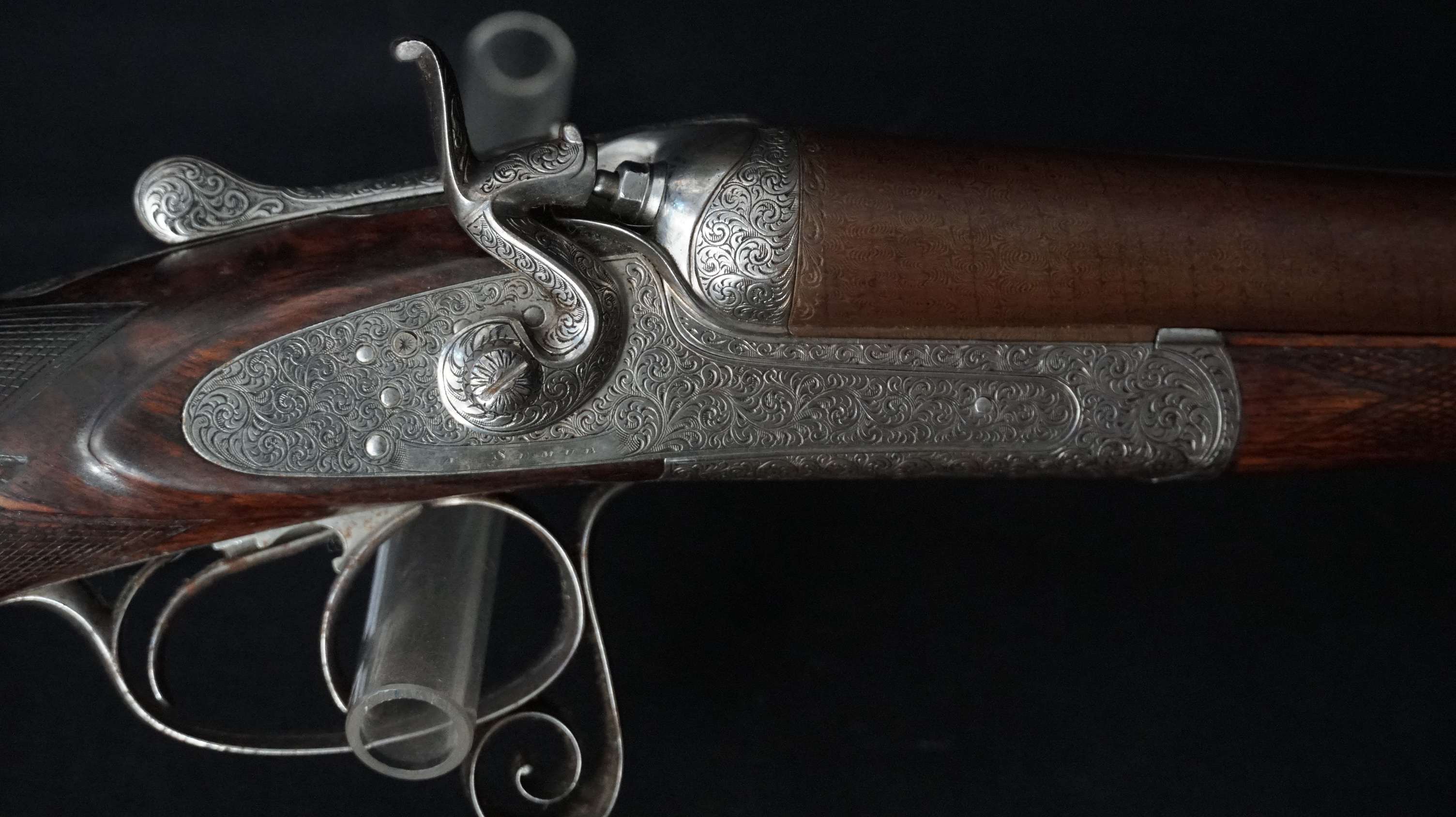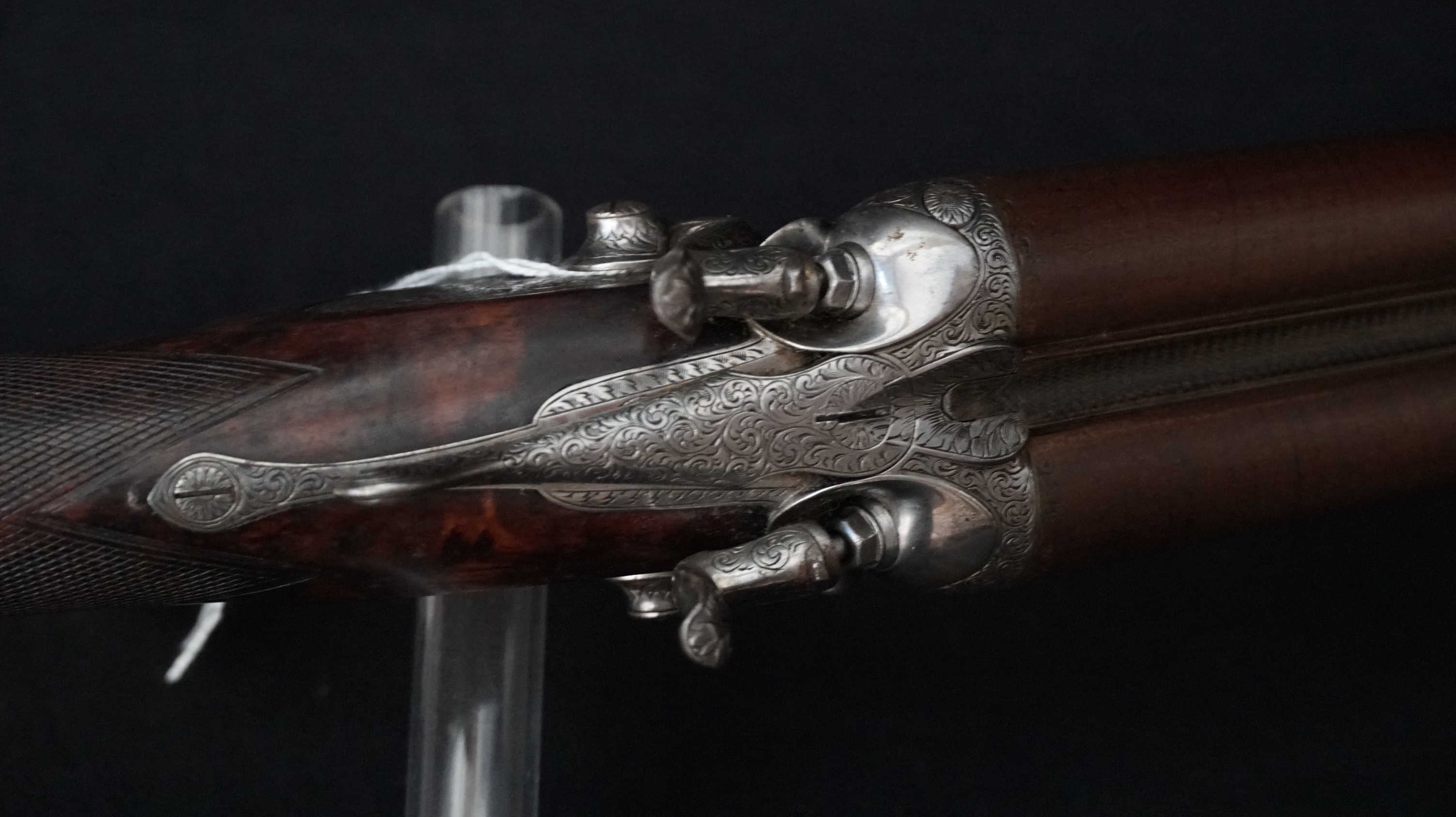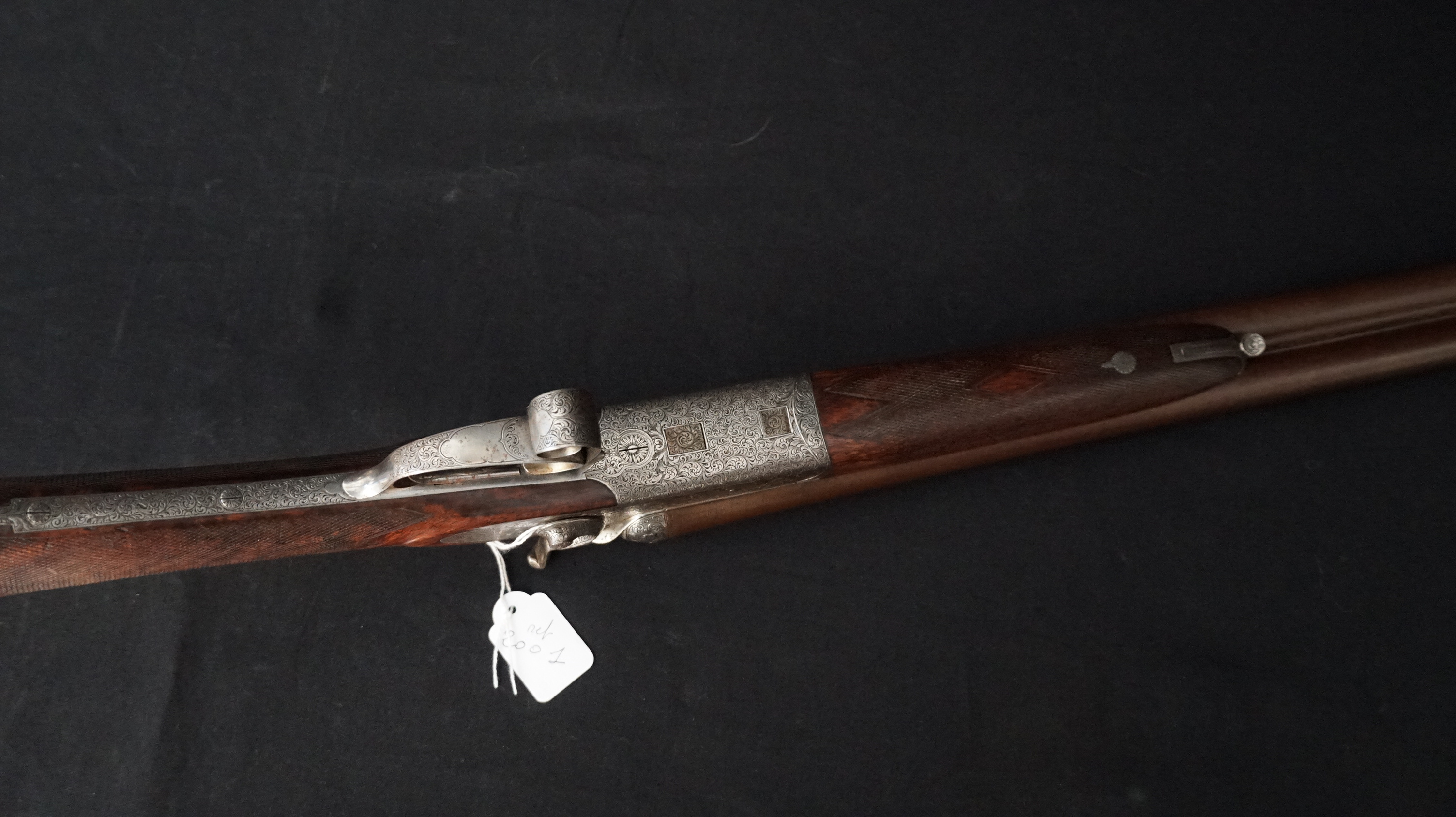 JUXTAPOSE BOMPARD A CHIENS EXTERIEURS, CAL 20/65, canons damas 70cm intérieur en bon état, diamètre ame 15.8, chokes lisse et 1/4, très joli beau vernis au tampon, crosse anglaise L 350mm avec plaque acier, pédale en bout sur le devant, gravure tapisserie anglaise moyenne, poids 2.505 kg, très beau fusil ancien (1910) d’artisan.