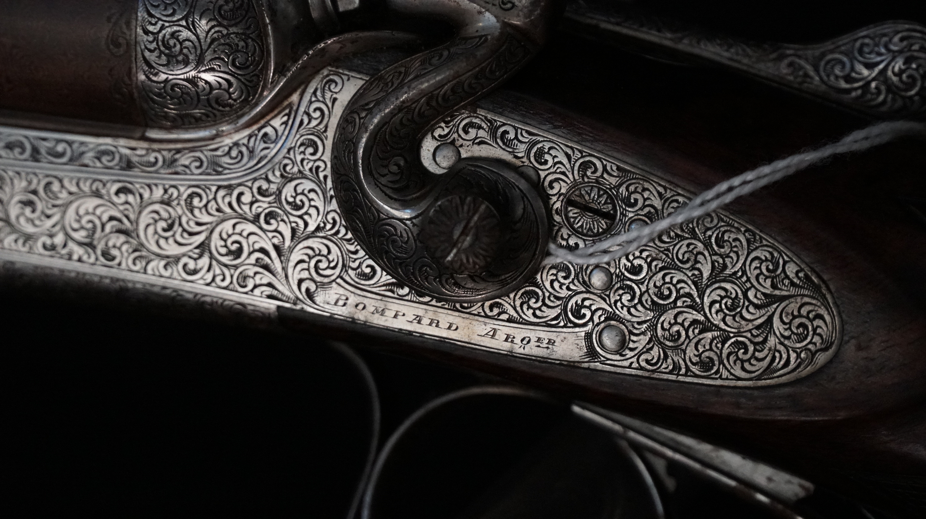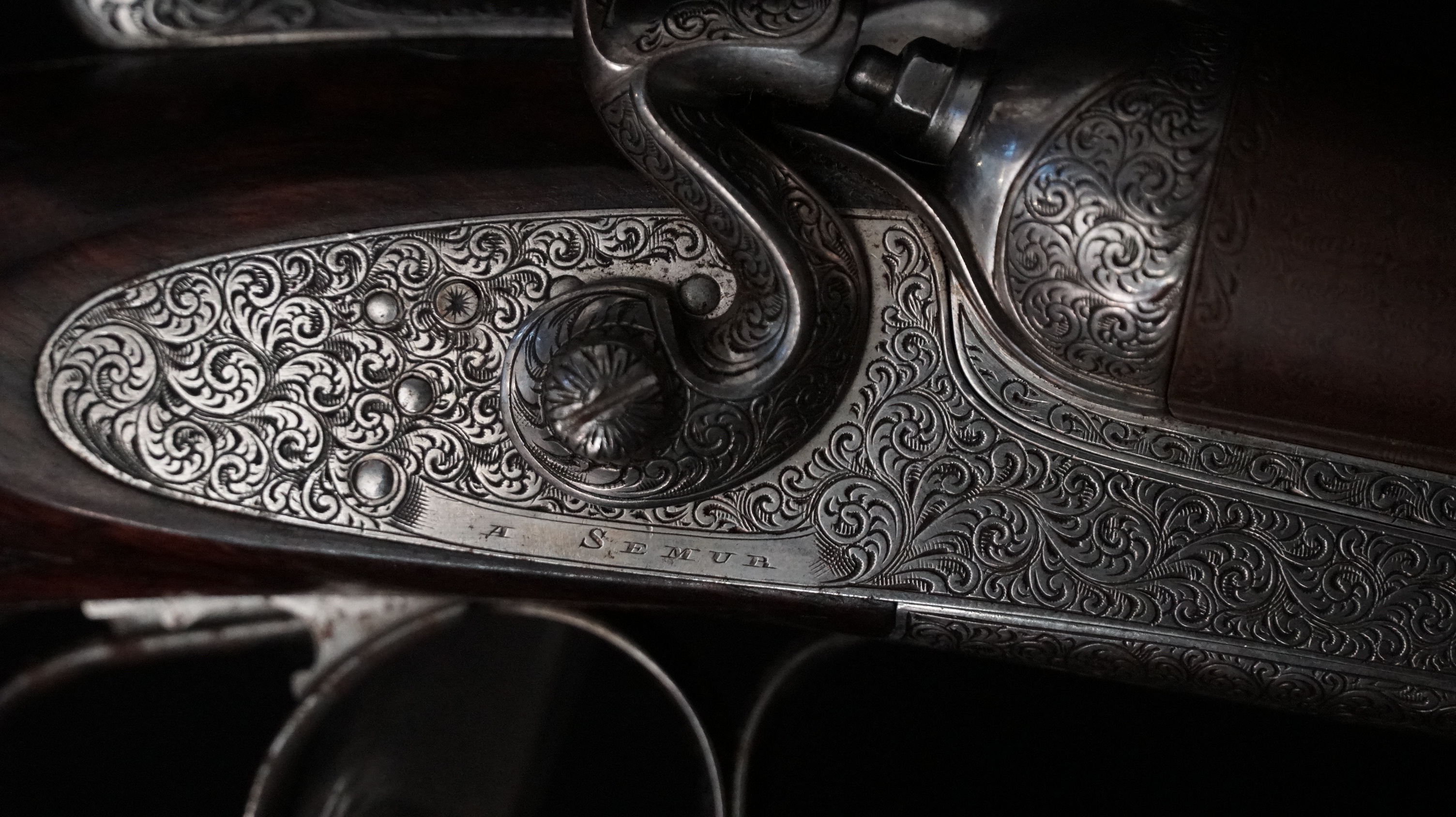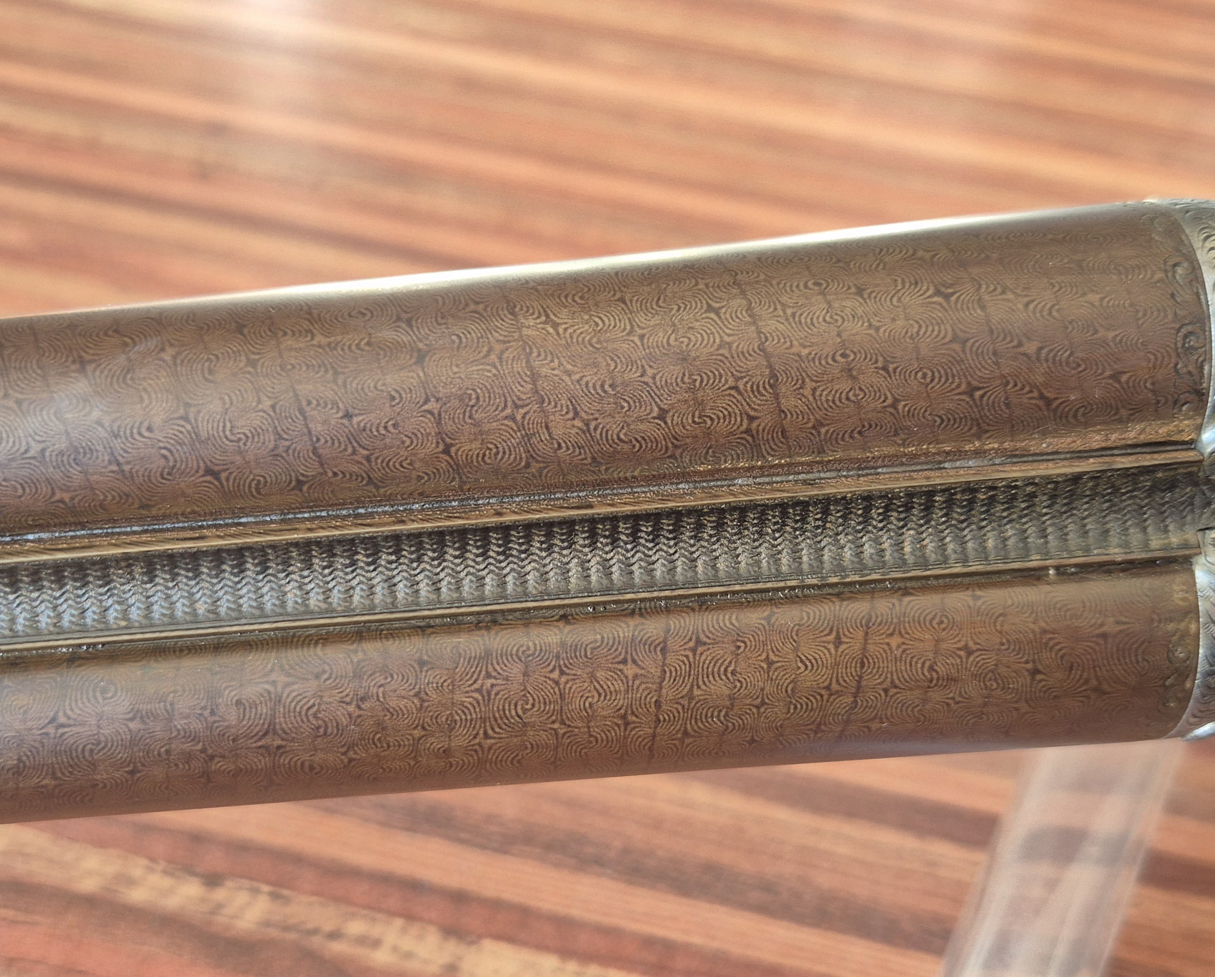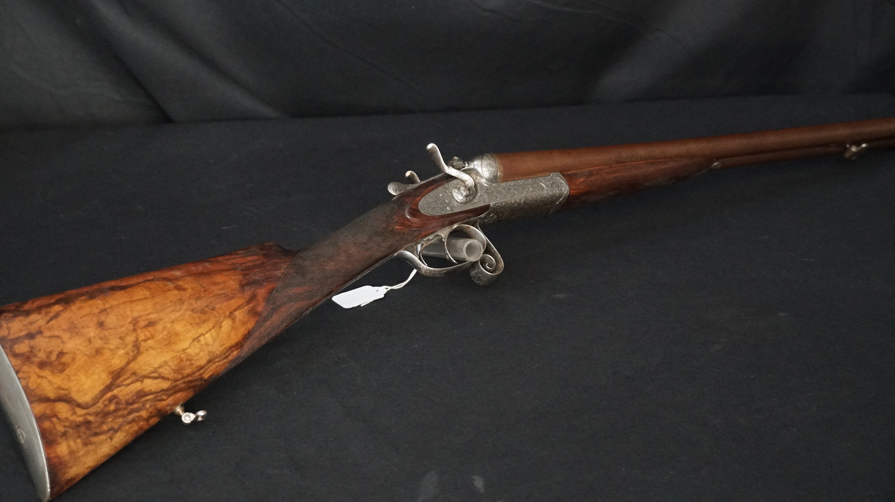 JUXTAPOSE BOMPARD A CHIENS EXTERIEURS, CAL 20/65, canons damas 70cm intérieur en bon état, diamètre ame 15.8, chokes lisse et 1/4, très joli beau vernis au tampon, crosse anglaise L 350mm avec plaque acier, pédale en bout sur le devant, gravure tapisserie anglaise moyenne, poids 2.505 kg, très beau fusil ancien (1910) d’artisan.