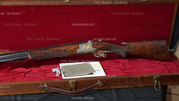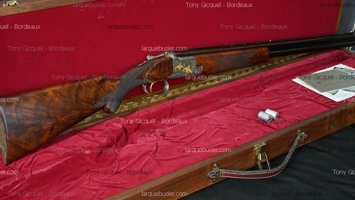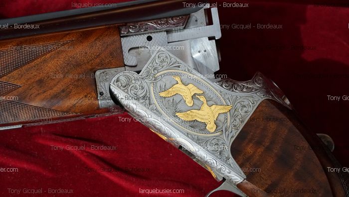 BROWNING BLACK DUCK CAL 12/70 EDITION LIMITEE 162/500, monodétente, ejecteurs, diamètre ame 18.3, chokes 1/4 et 3/4 d’origine, crosse 1/2 pistolet l 365mm tout bois d’origine, gravure sujets dorés et arabesques, poids 3.470 kg, valise en bois d’origine, livret. canon intérieur nickel, quelques très légères traces sur l’extérieur, pas de jeu.