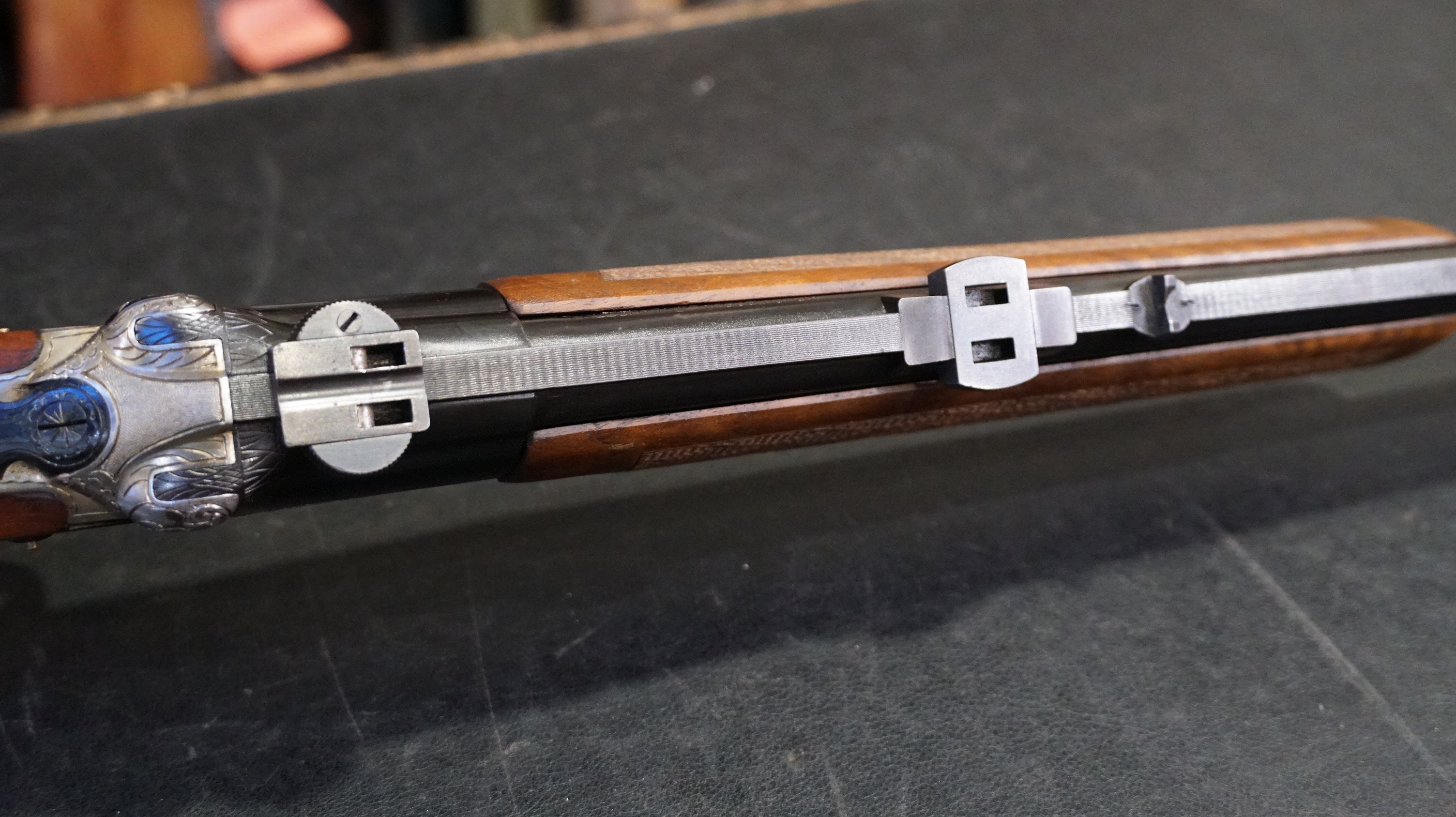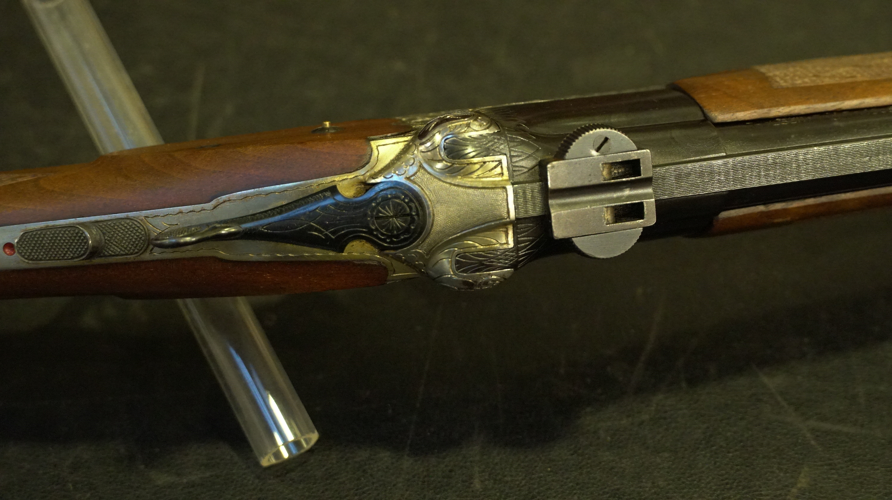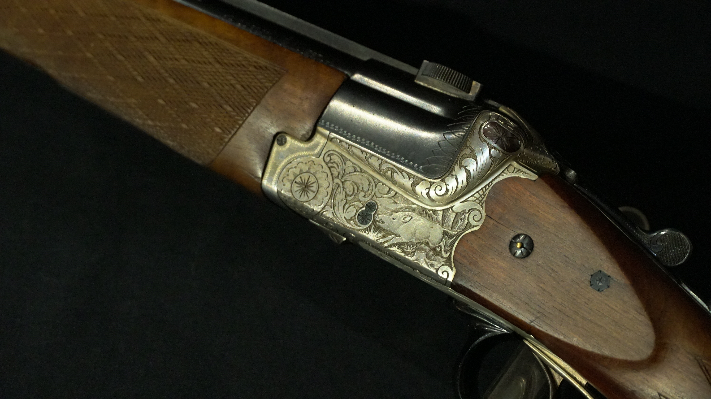 EXPRESS HEYM CAL 9.3X74 R, crosse pistolet à joue L 360 mm, gravure animalier et floral, canons 63.5cm, équipée avec montage à crochet.