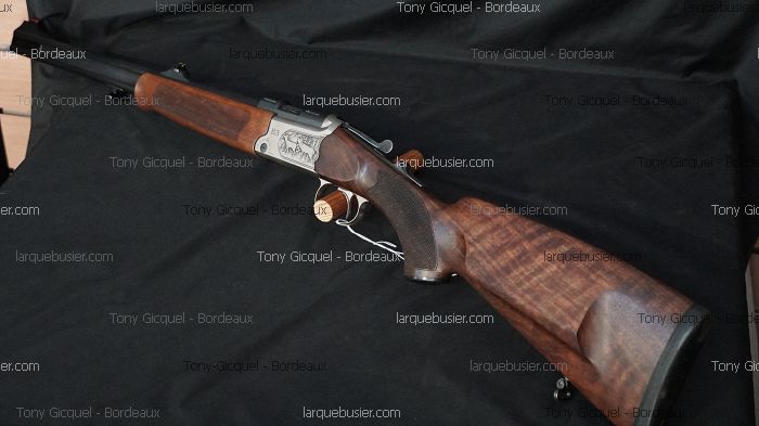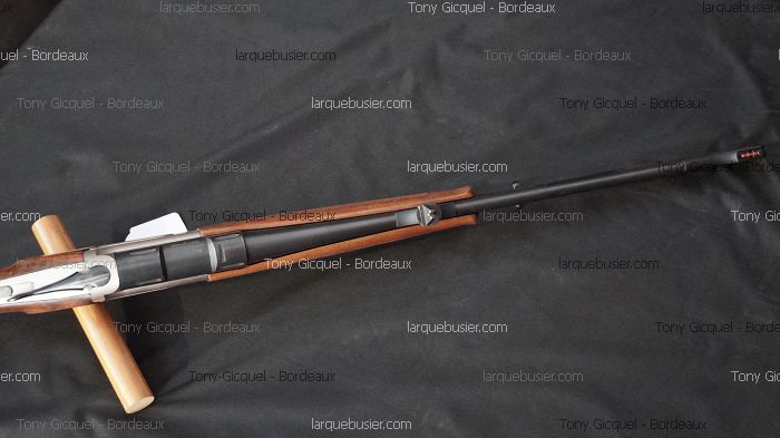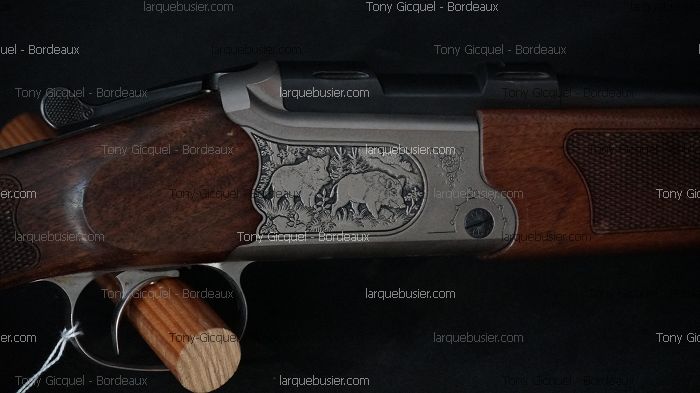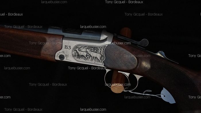 MERKEL B3 CAL 30R BLASER, canon 56 cm avec organe de visée, monodétente, armeur séparé, crosse pistolet à joue bavaroise L 375mm avec amortisseur de 15mm. gravure animalière. Poids 3.067kg, très bon état mécanique, quelques traces d’utilisation sur les bois, grenadières.