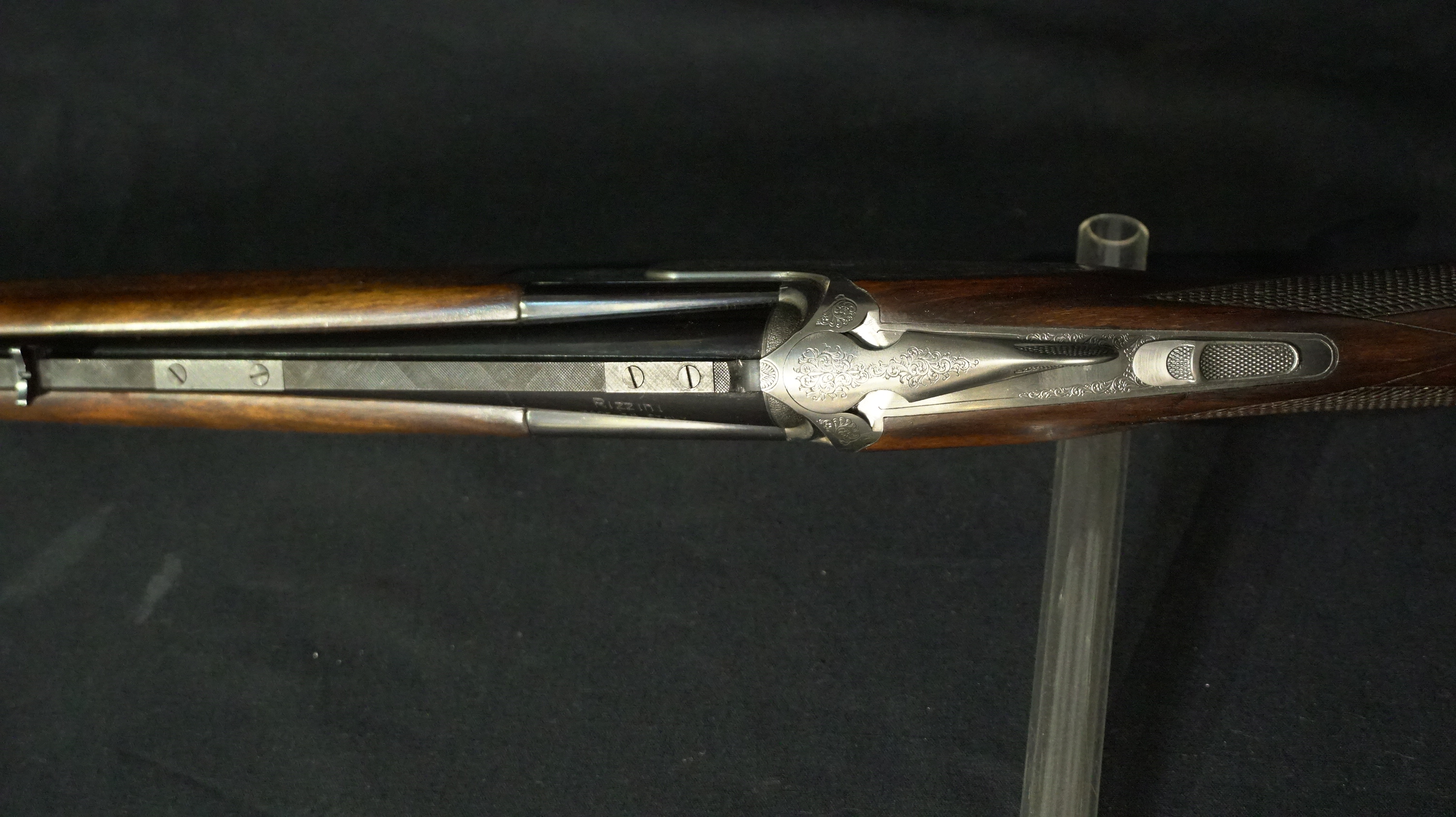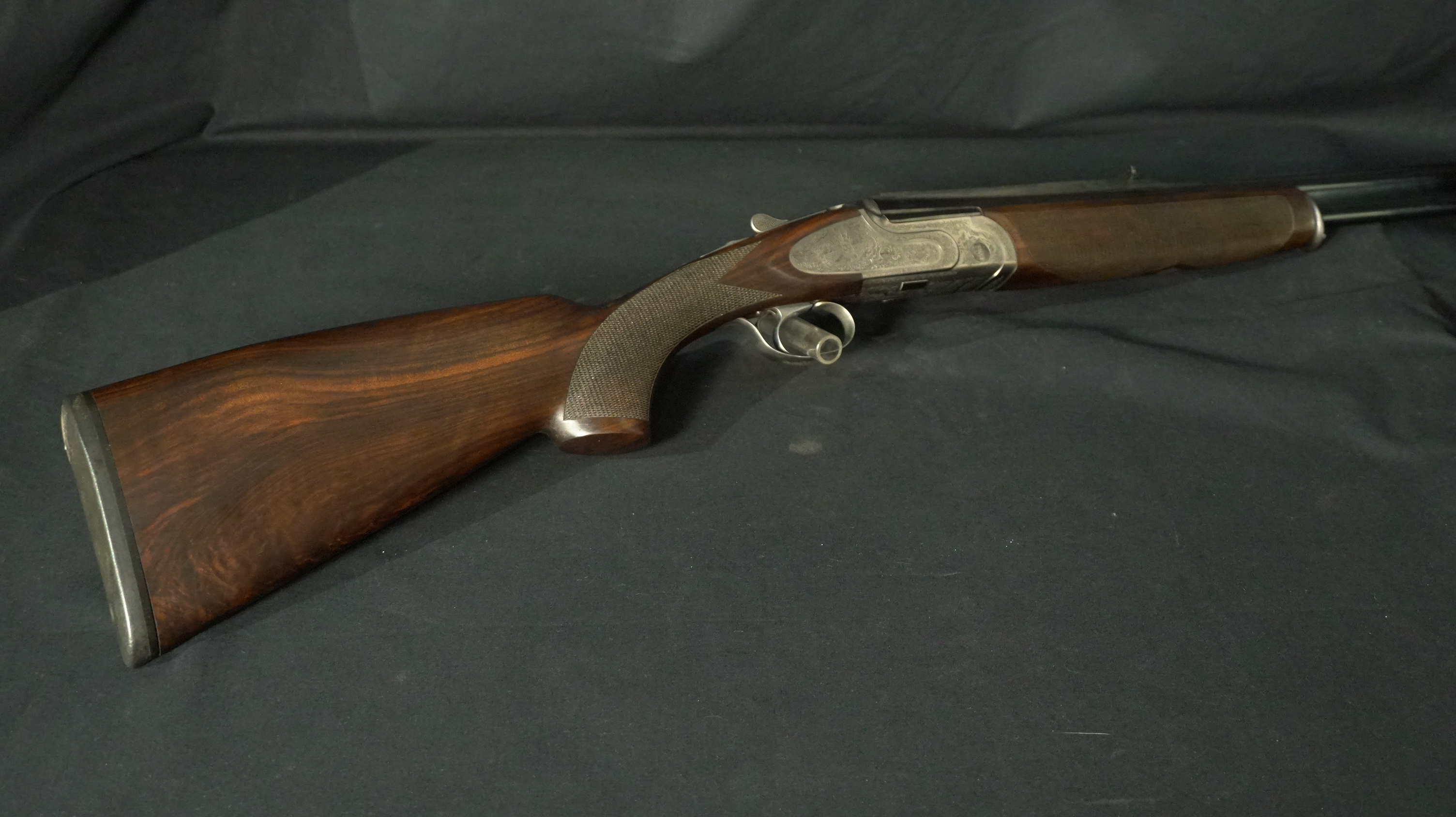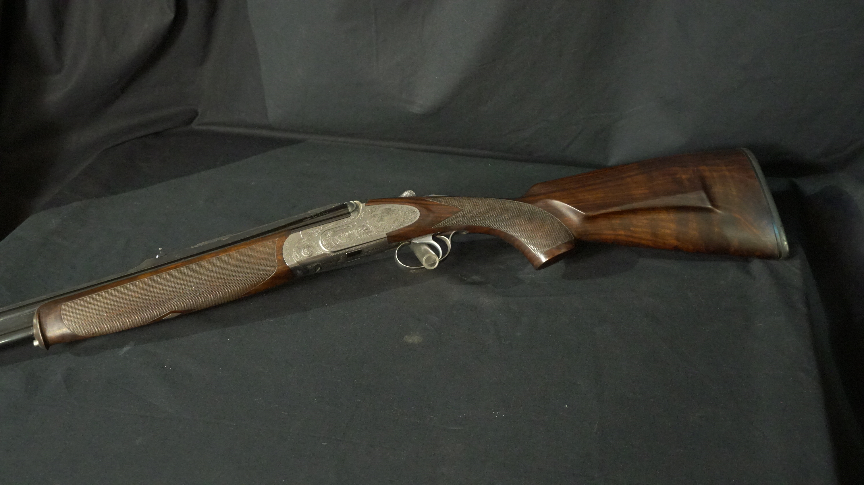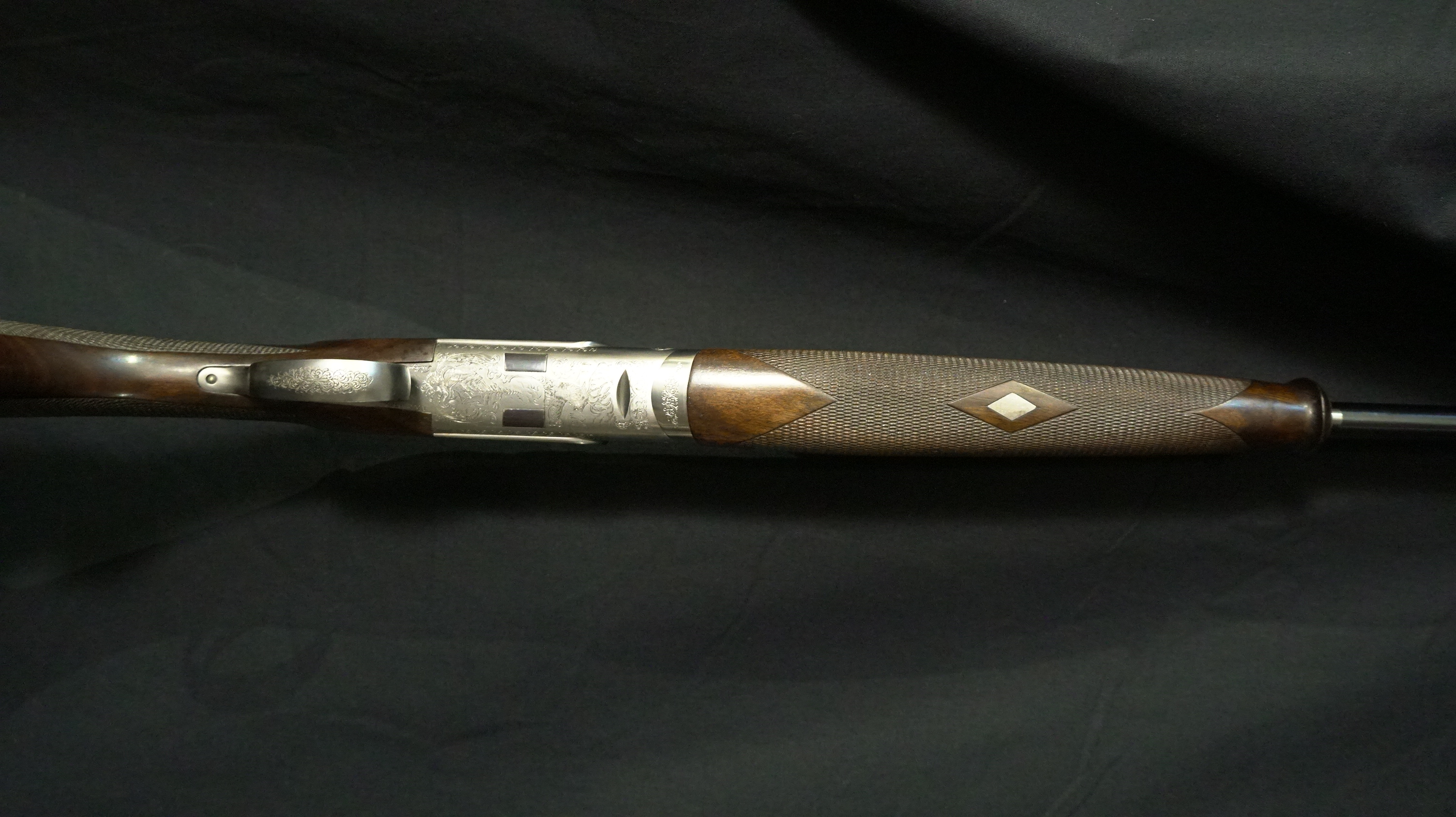 EXPRESS RIZZINI CAL 9.3X74 R, crosse pistolet à joue L 370mm avec amortisseur fin, contre platines, monodétente, éjecteurs, canons 60cm avec organe de visée, gravure animalière et anglaises.
