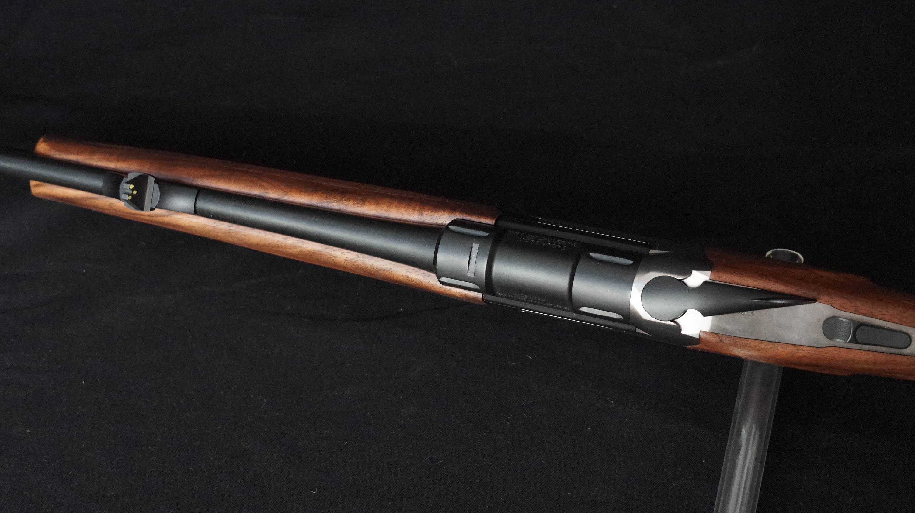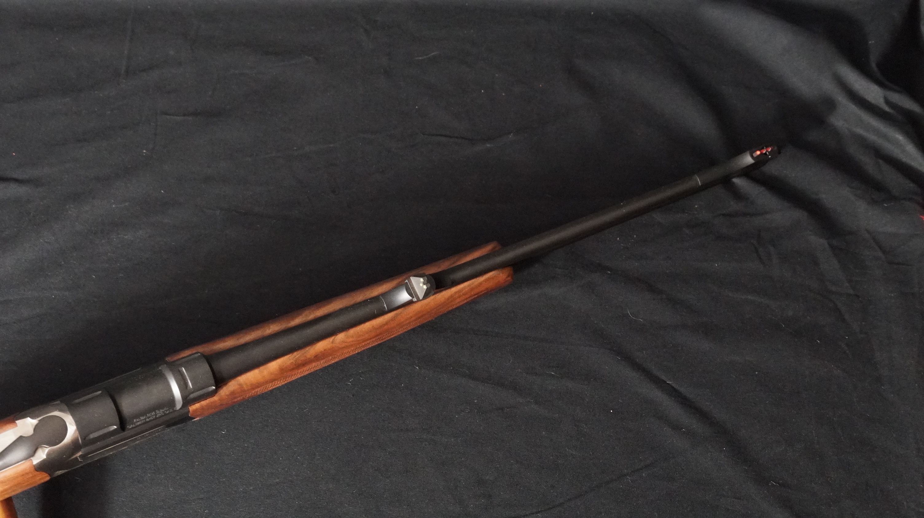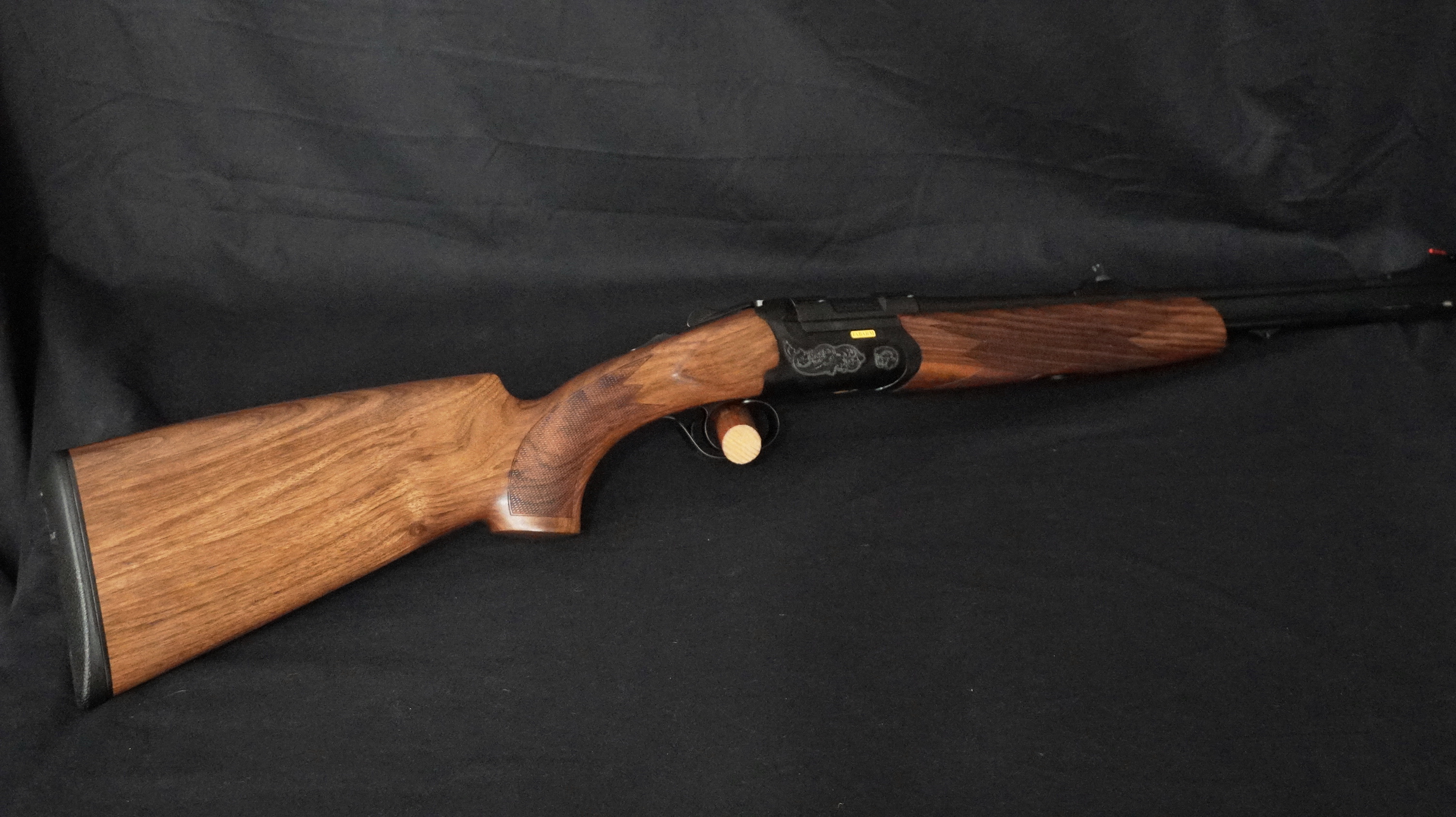 Une carabine express dont l’élégance tient autant à sa magnifique finition noire satinée qu’à ses écussons d’un jaune éclatant qu’aux parfaites proportions de sa bascule. La gravure avec de larges et belles volutes est profonde afin de créer un fort contraste. Le mécanisme est à extracteur, facilitant ainsi la récolte des étuis vides.