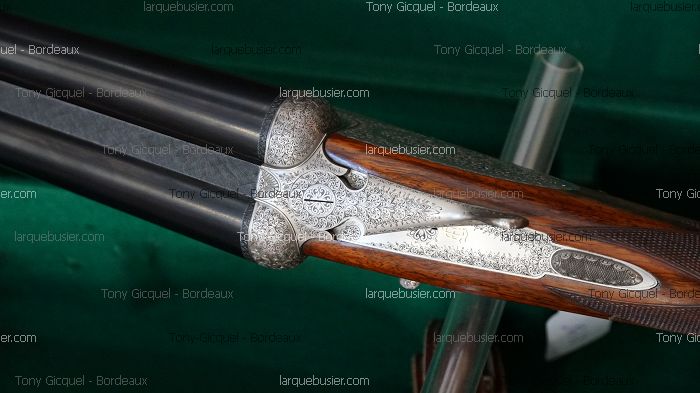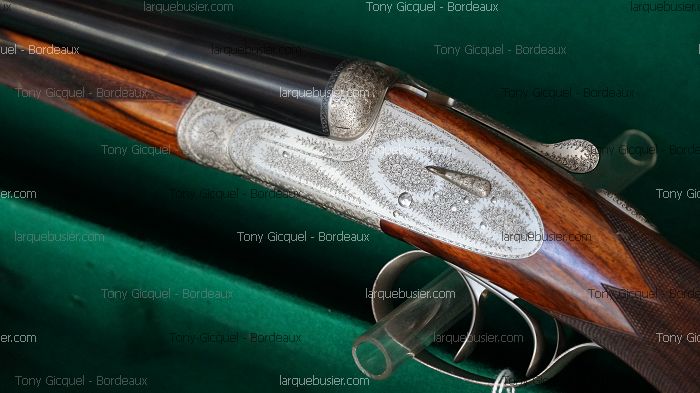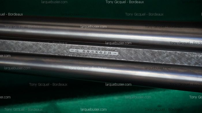 GRANGER A PLATINES CAL 12/70 GRAVURE FREYCON, canons 71cm demi bloc, diamètre ame 18.5, chokes 1/4 et 3/4, crosse anglaise L 380mm tout bois, double détente, ejecteurs, poids 2.966 kg, superbe état, en valise