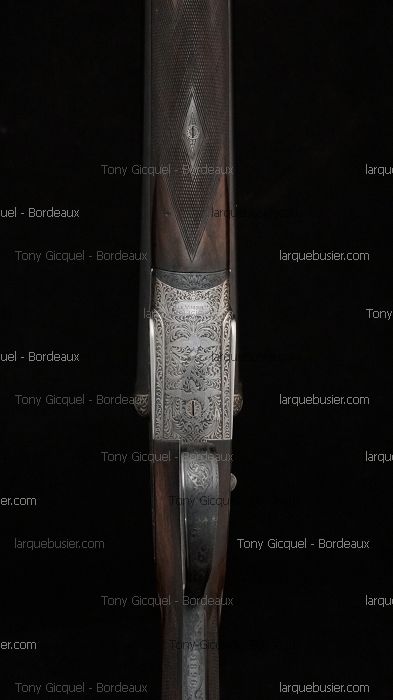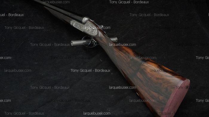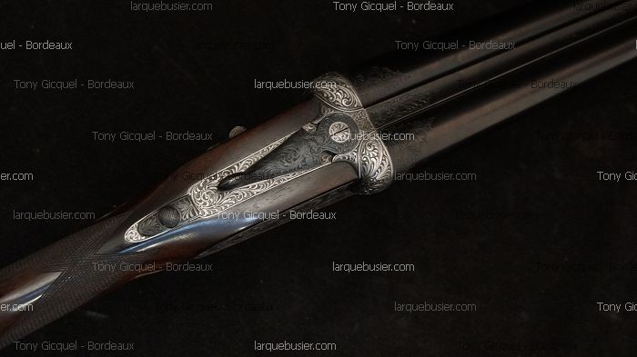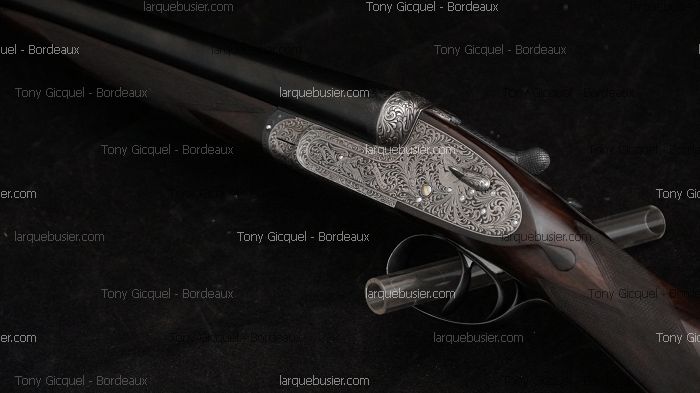 JUXTAPOSE A PLATINES G BEASSE CAL 12/65, crosse anglaise l 375 mm, canons 72cm, chokes 1/2 et full, magnifiques gravures (chimères et florales) en fond creux, arme en très bon état. vendue en valise cuir.