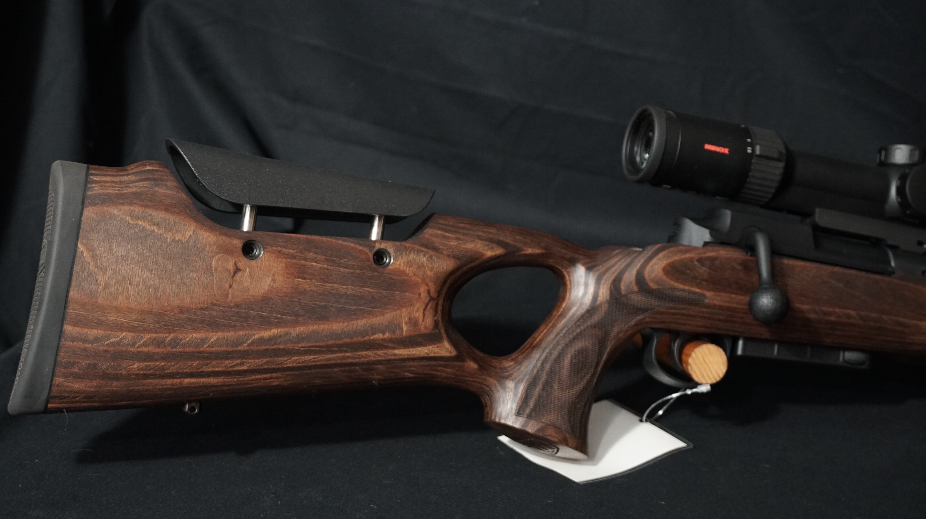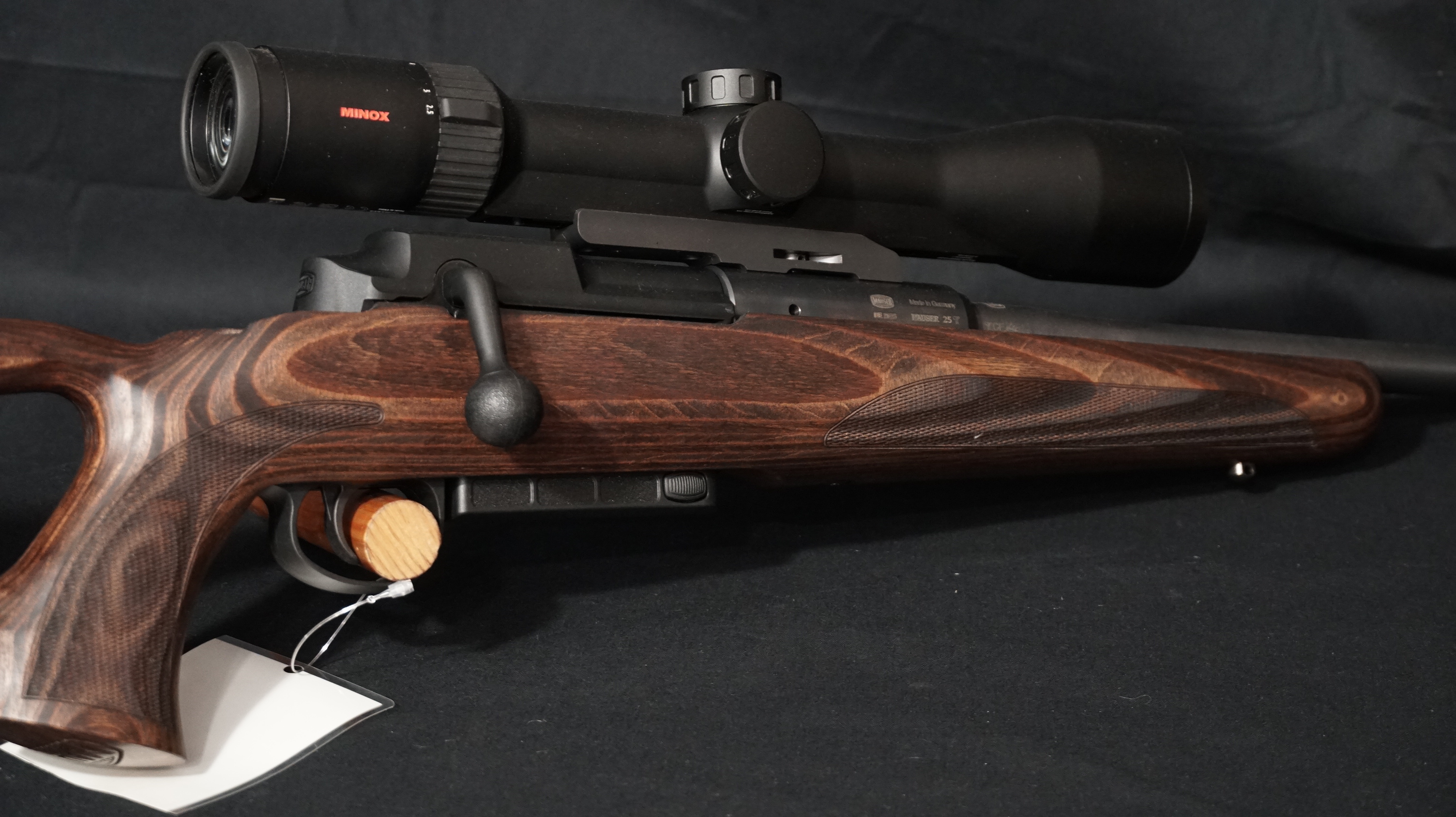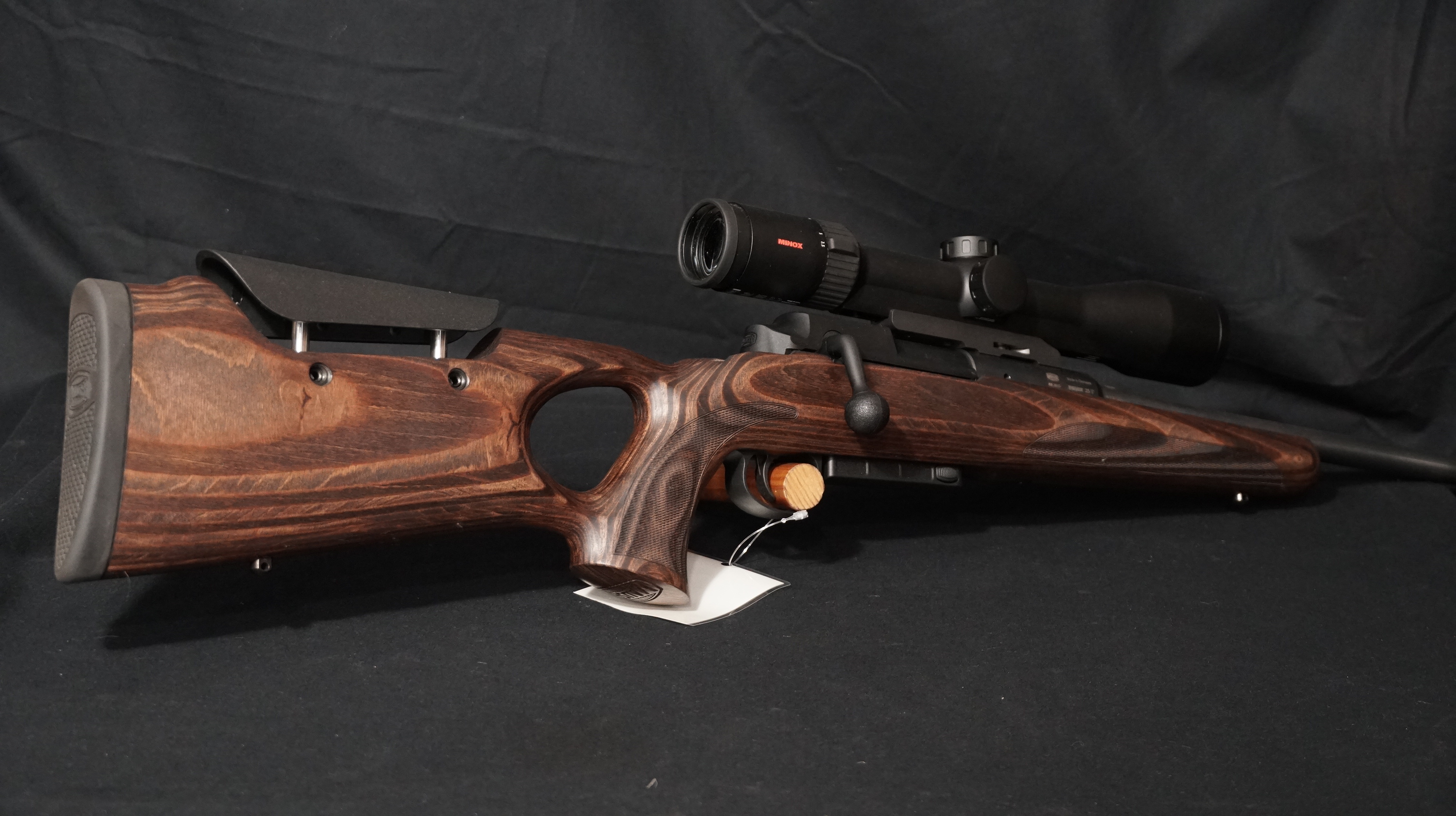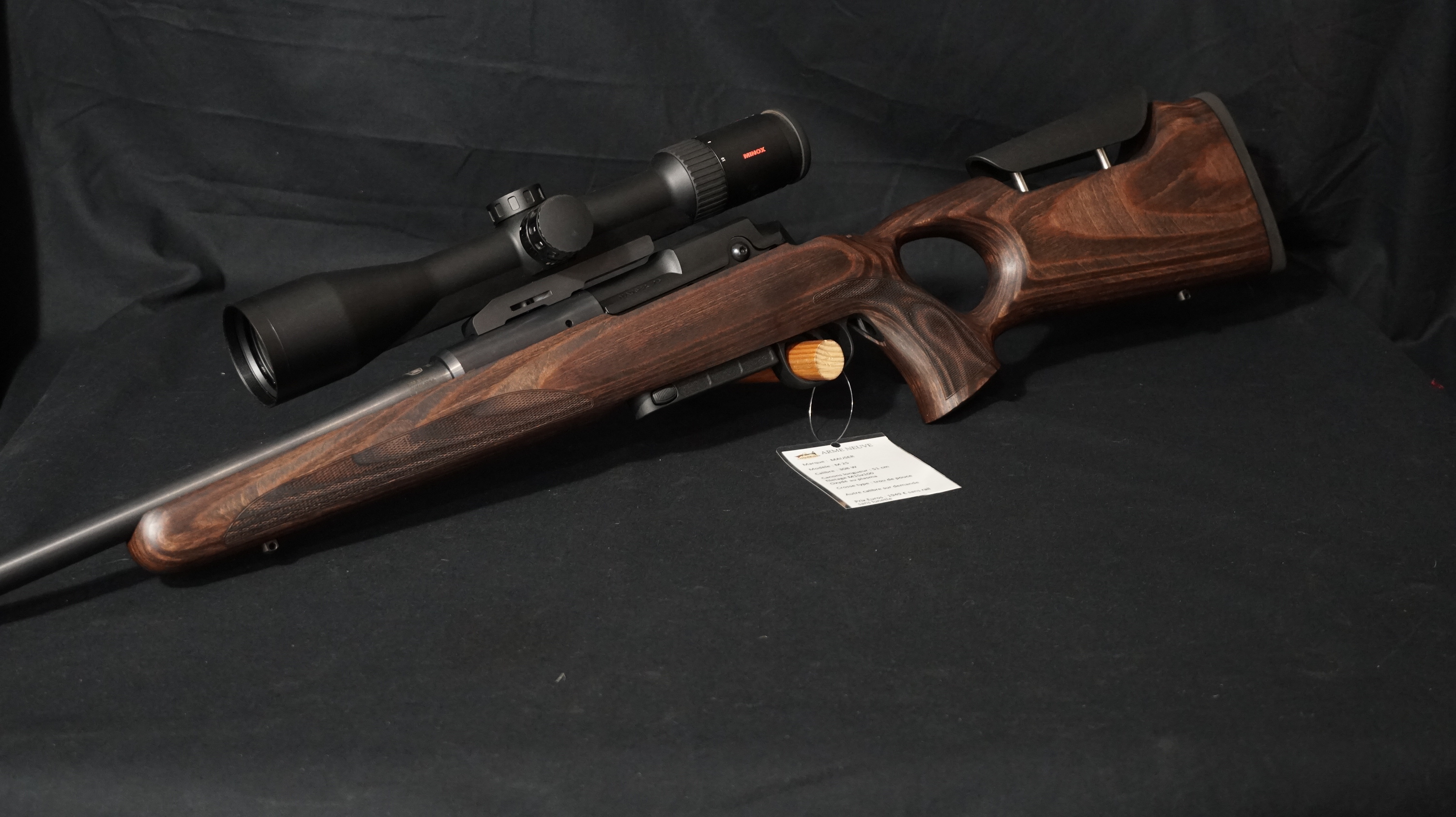 - Visée : équipée avec lunette de visée MINOX RS4 2,5-10×50 S à rail réticule 4A avec montage type »single base mount » (peut-être vendue sans lunette ou avec un autre modèle)