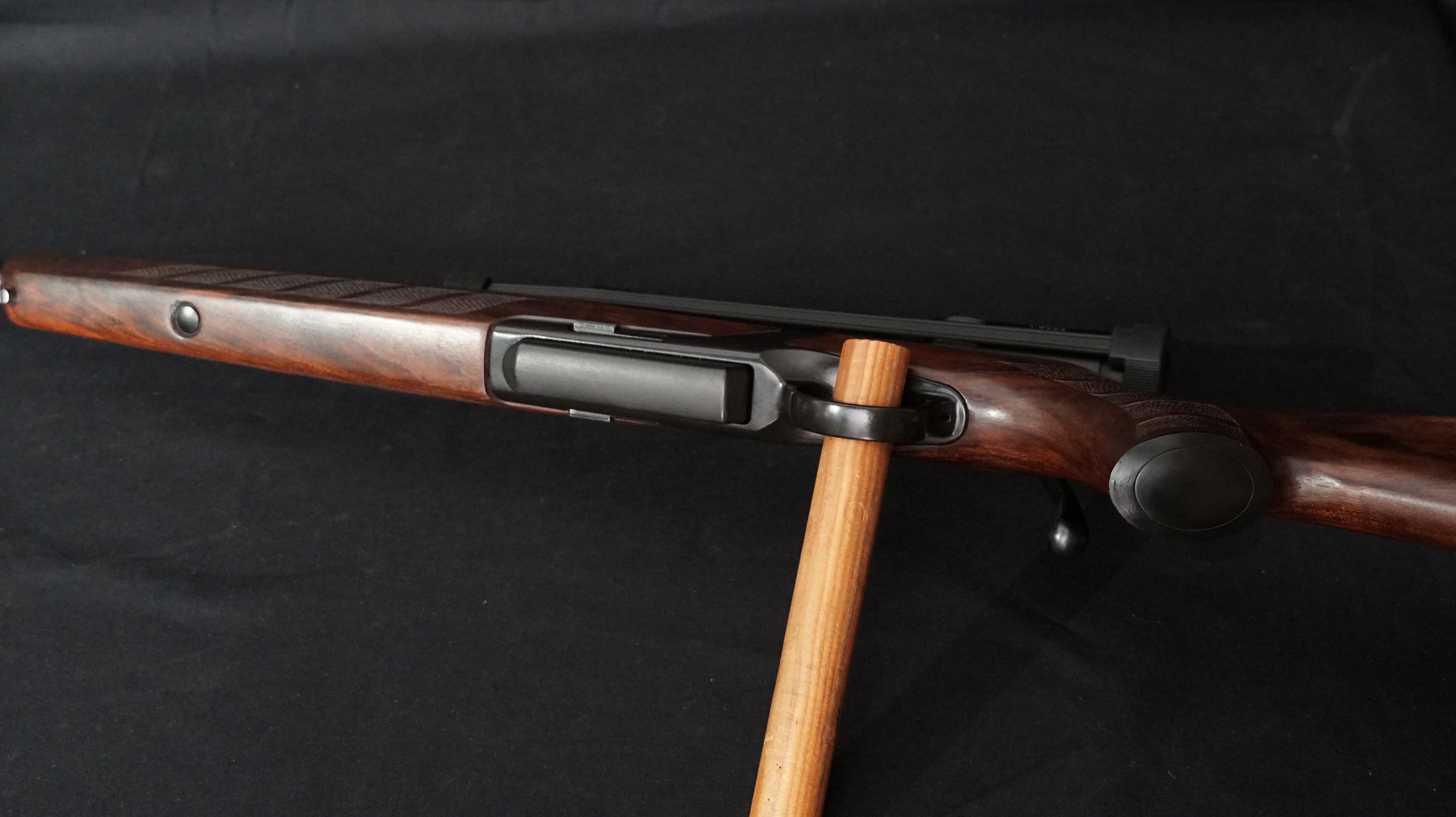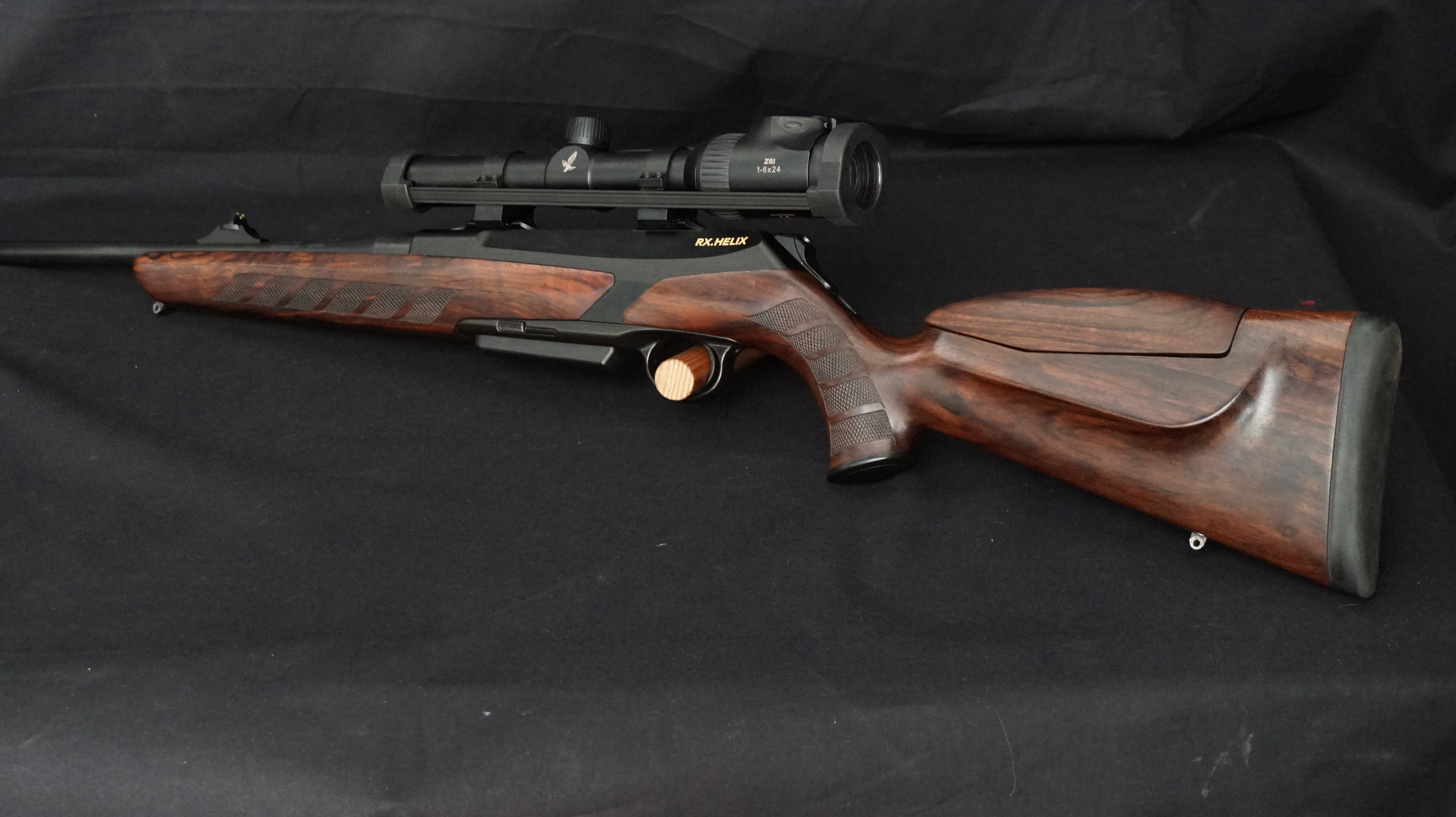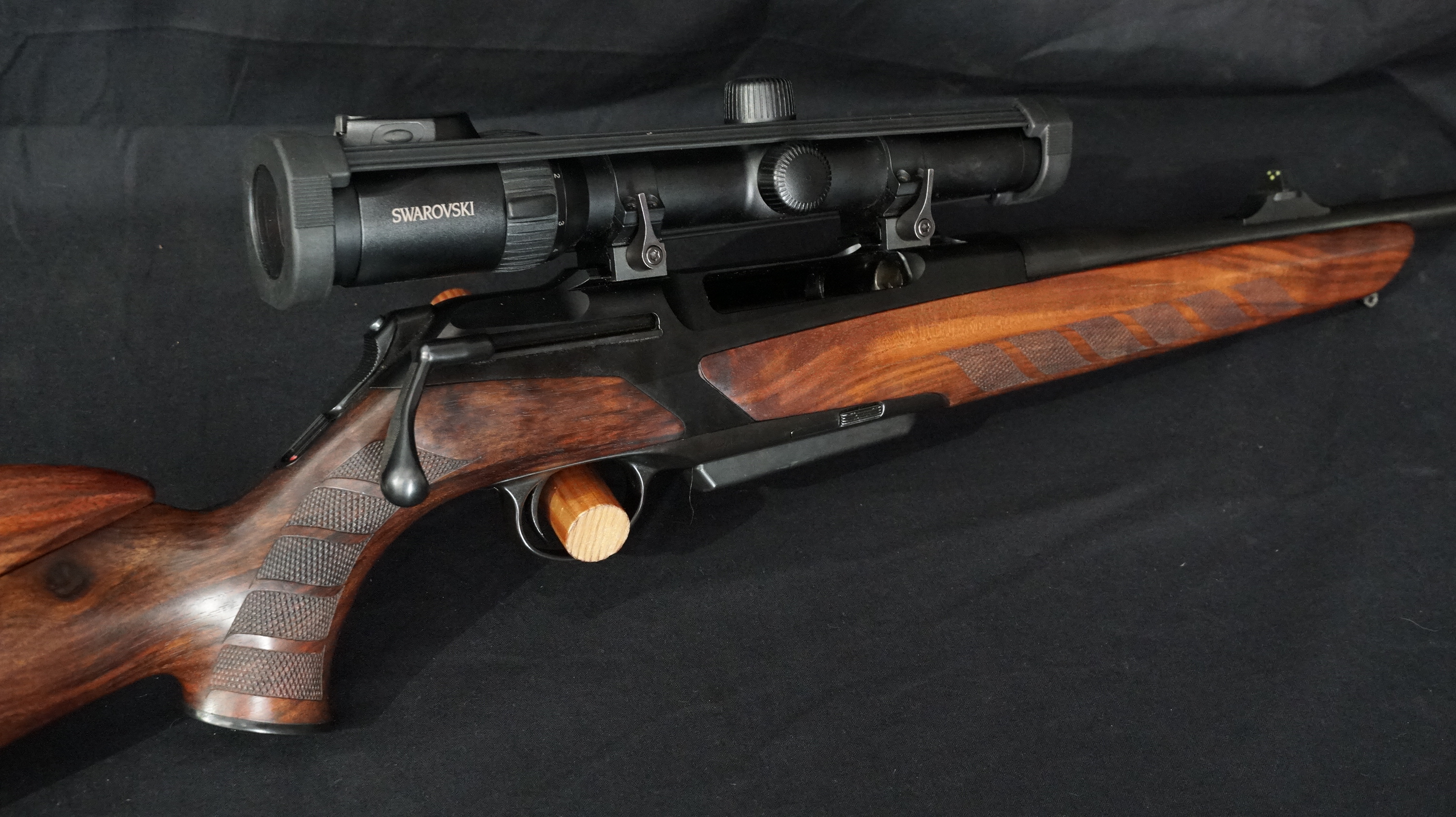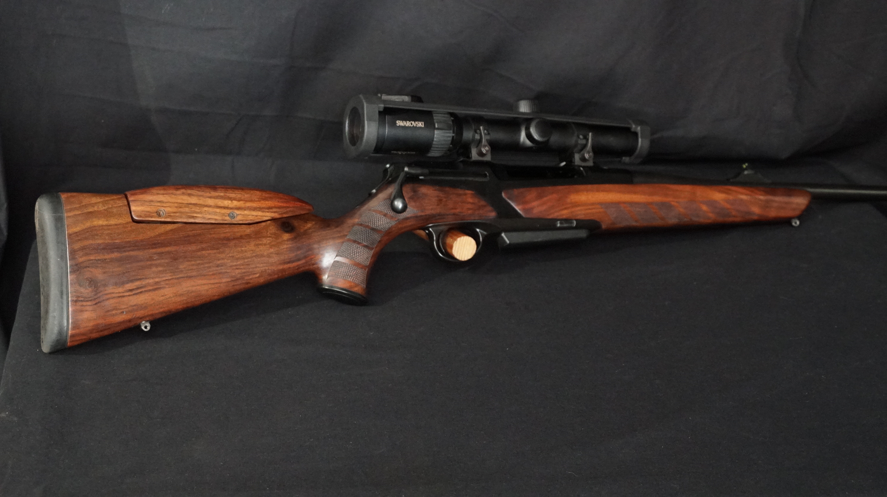 MERKEL HELIX ELEGANCE cal 300wm equipé lunette SWAROVSKI Z6I 1/6/24, canon 59 cm fileté pour recevoir modérateur de son, 2 chargeurs, crosse pistolet à joue L 365 mm avec busc réglable, très bon état, peu tiré