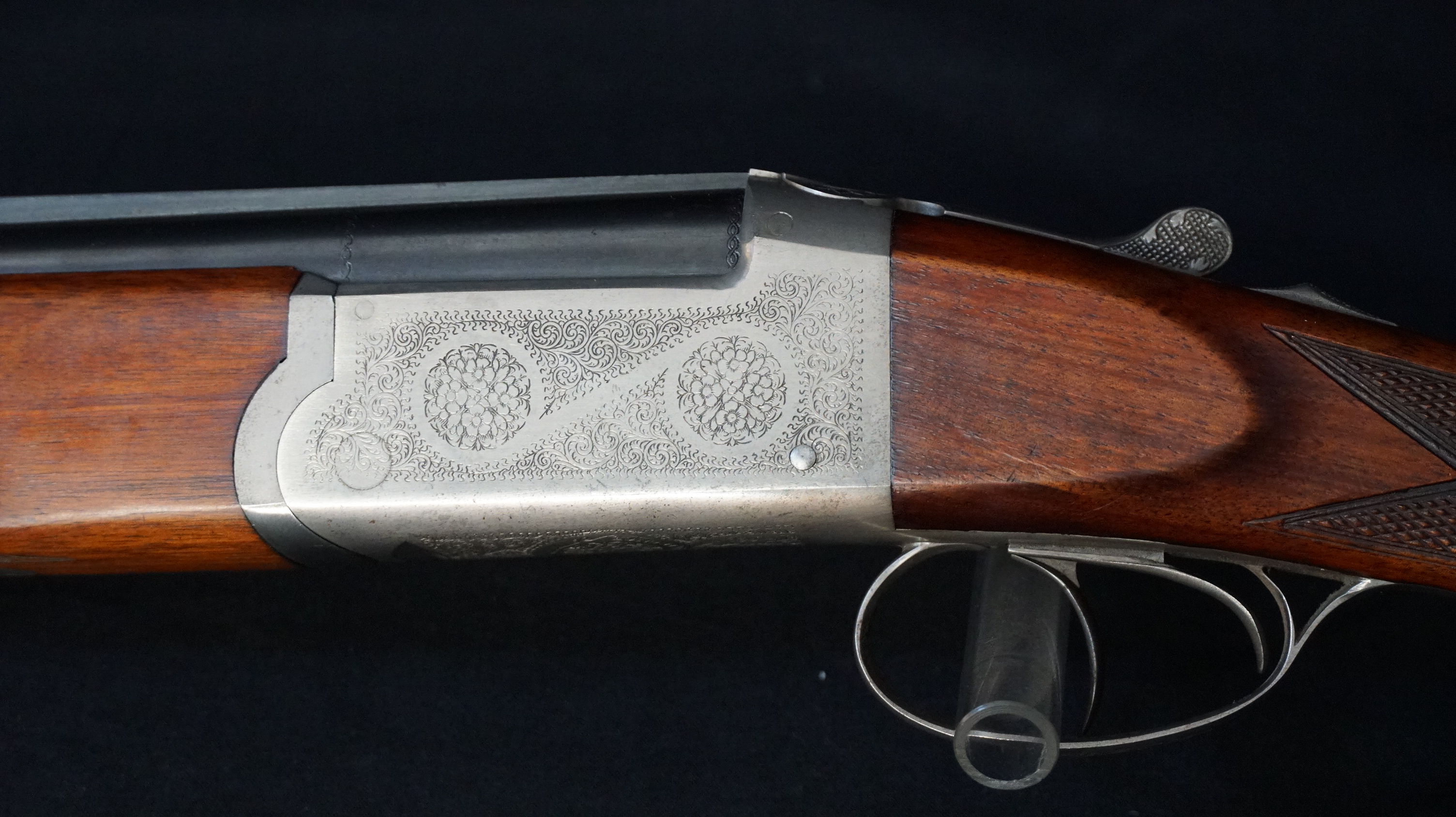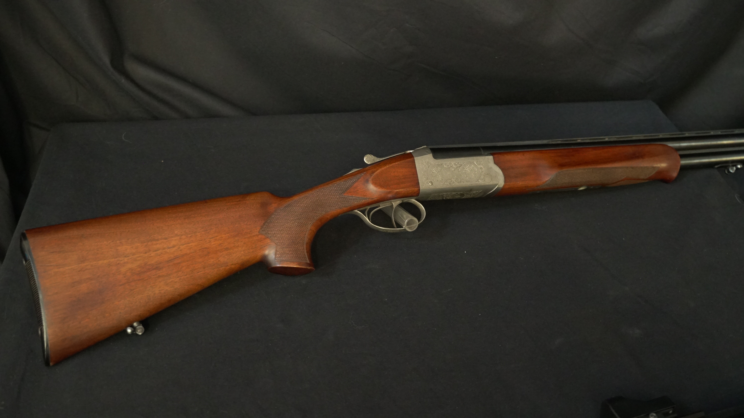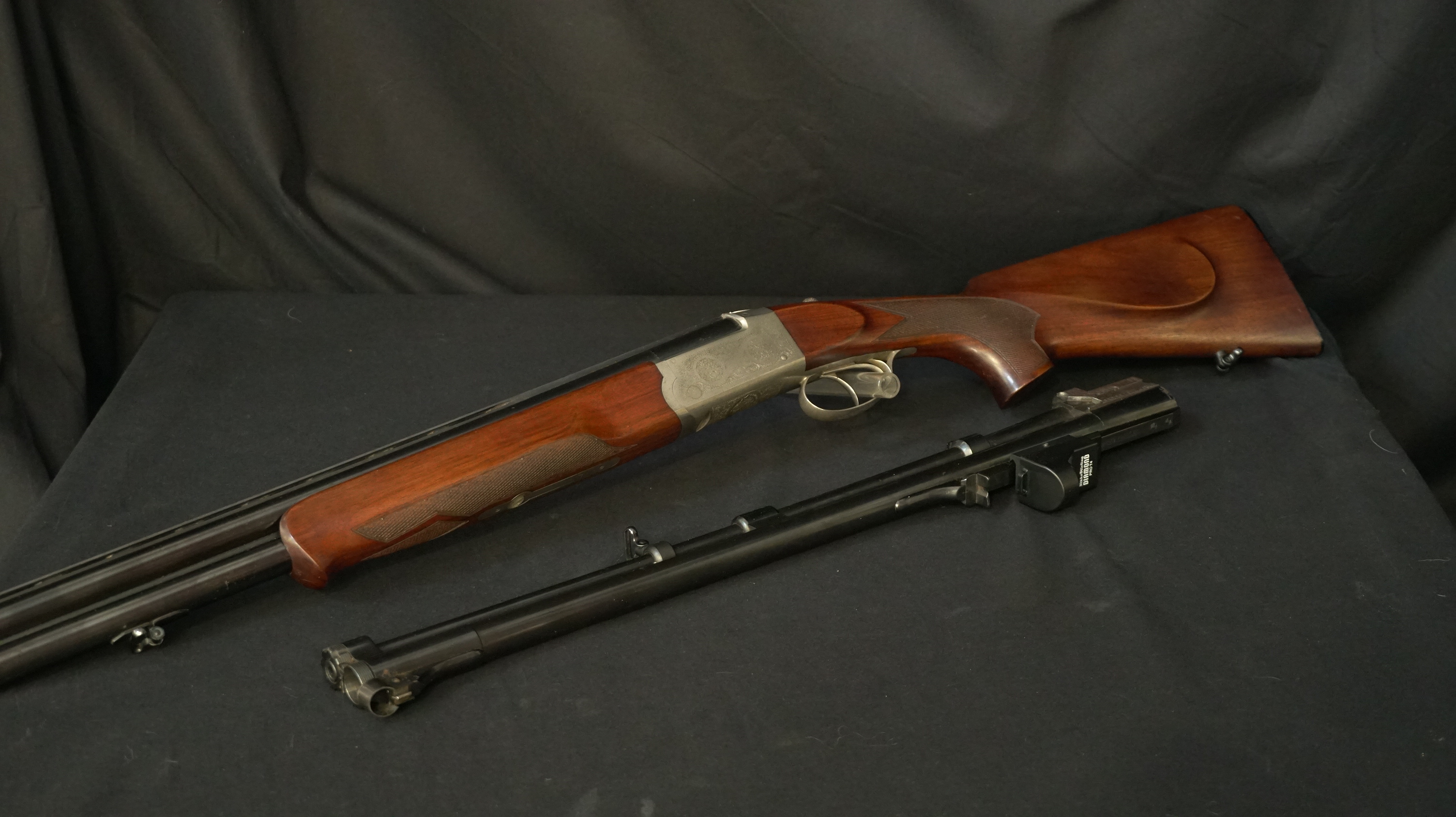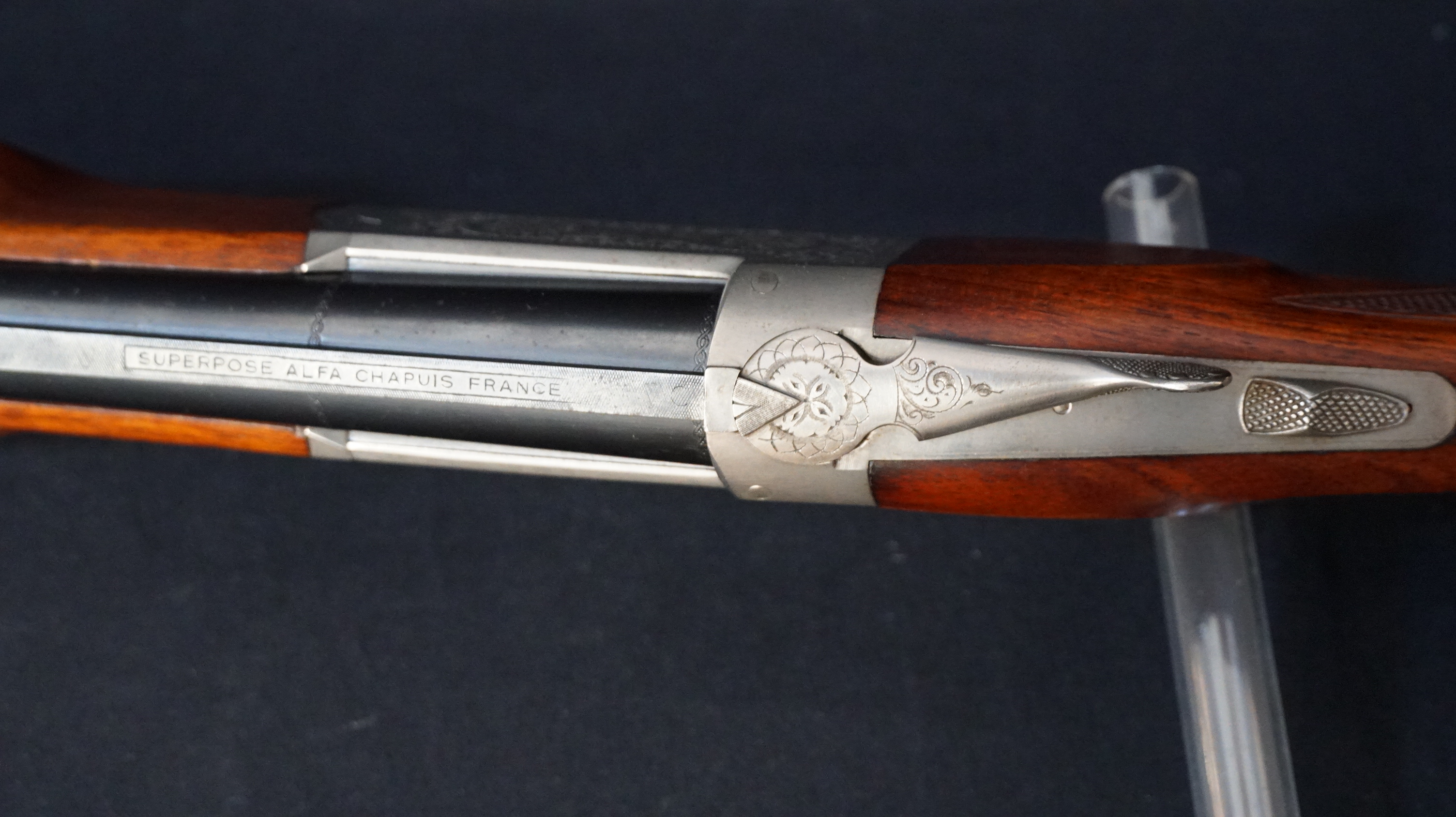 MIXTE CHAPUIS SUPERPOSE ALFA CAL 12/70 ET 12/70-7X65R, canons lisse L 70cm, chokes 1/4 et 3/4, canon mixte L 60cm équipé d’un PRO-T4, crosse pistolet à joue L 370 mm avec plaque d’origine, gravure anglaise, le tout en valise. Quelques traces d’oxydation sur l’ extérieur des canons, intérieur miroir.