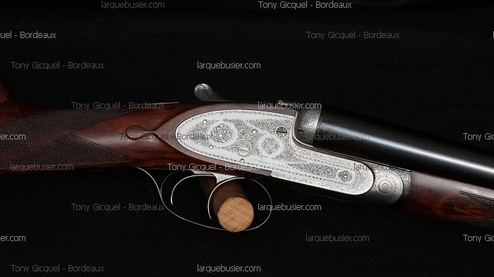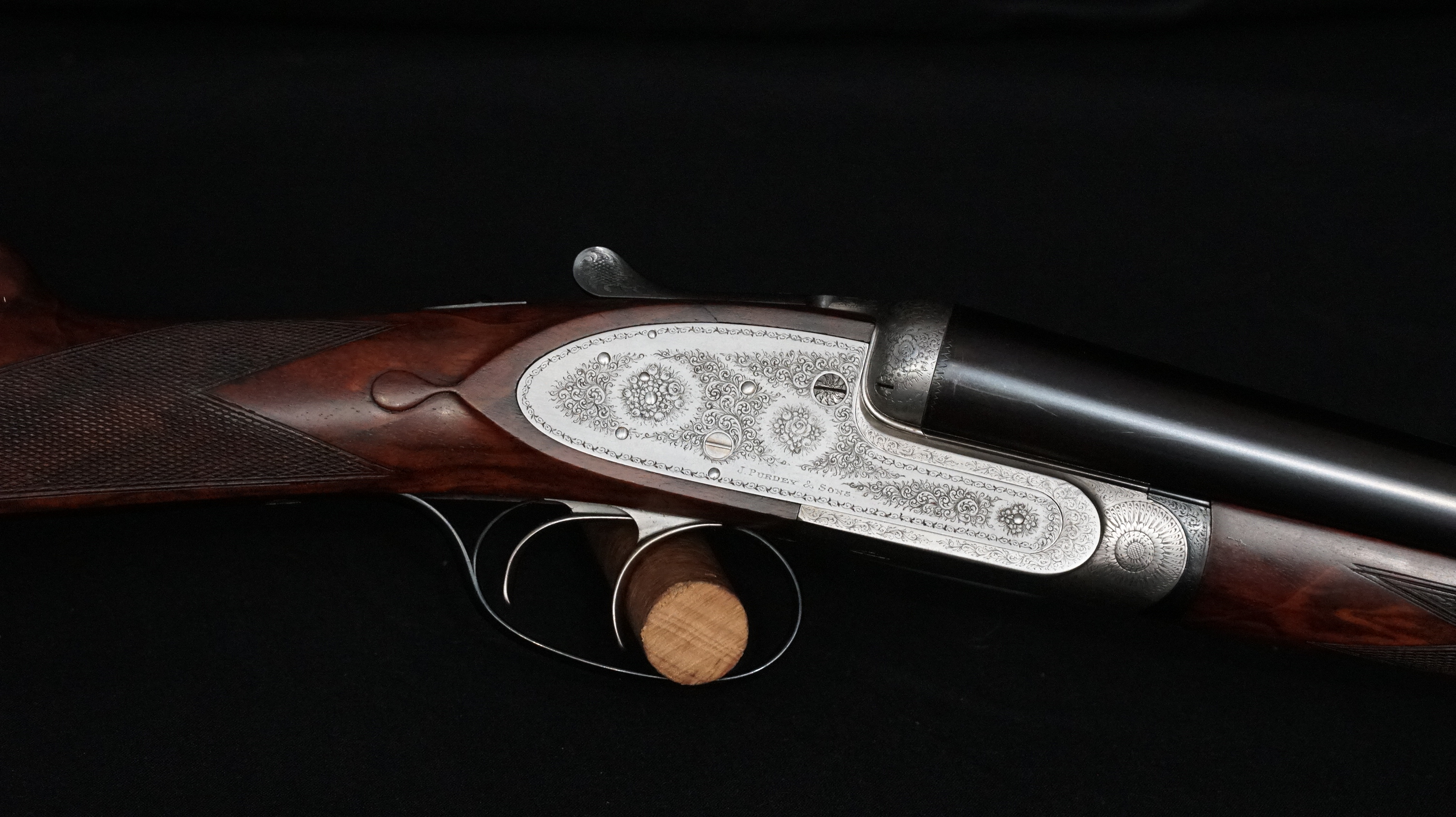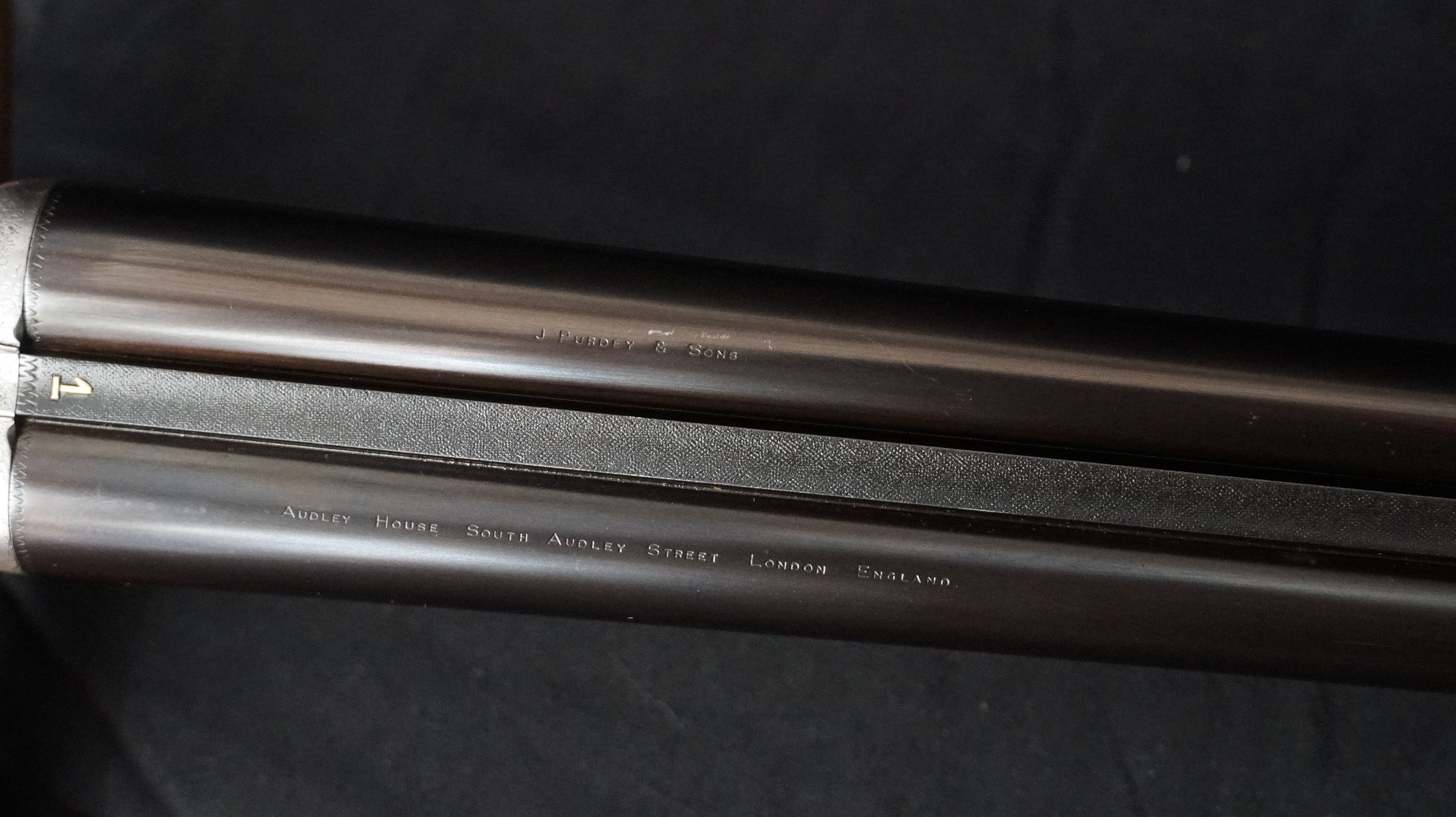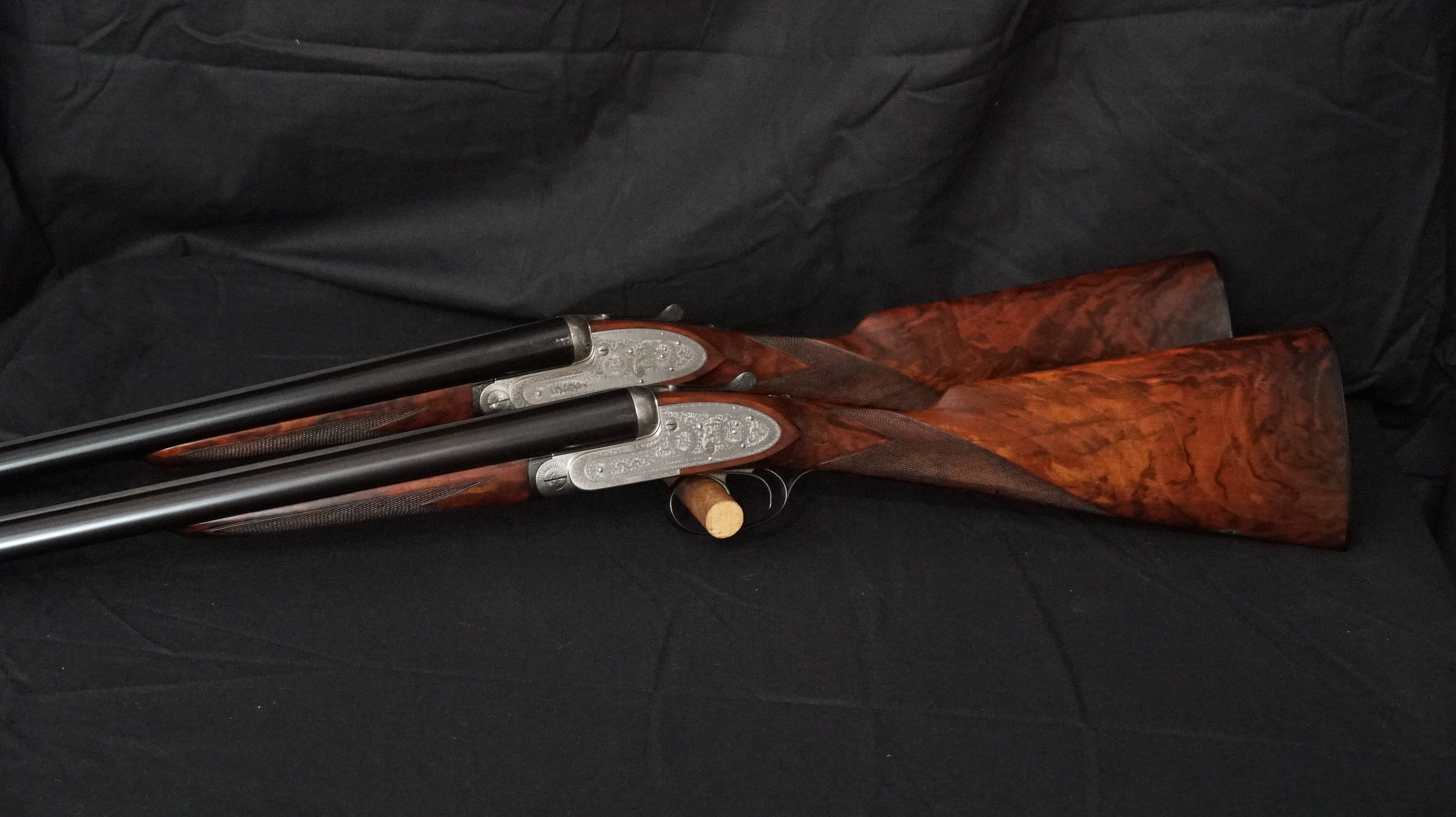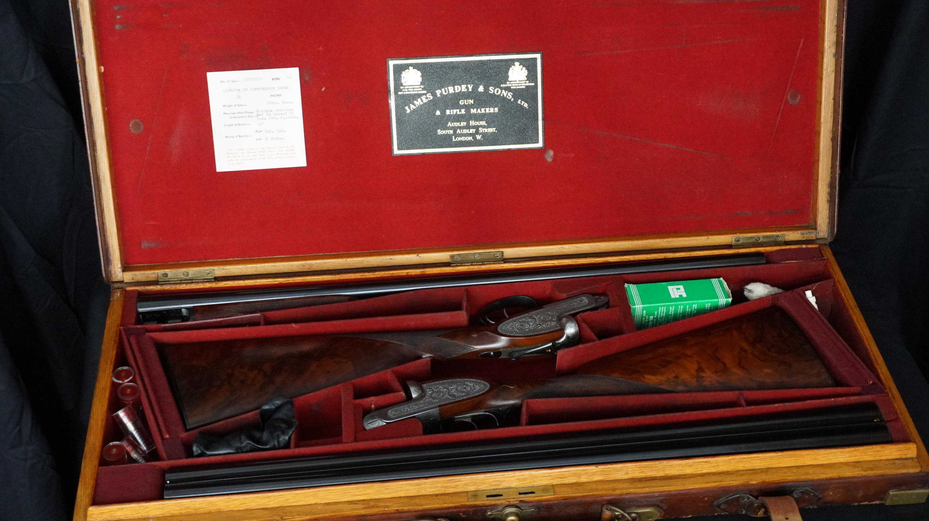 Paire de juxtaposés à platines Purdey cal 12/70, année 1912, canons 71cm, ame 18.63 sur le premier chokes 1/4 et 1/2, ame 18.65 chokes 1/4 et 1/2, crosses anglaises L 372mm, gravures fines anglaises, poids numero 1 : 3.184kg, poids numero 2-3.150 kg, fusils rénovés chez Purdey en 1975, valise fut chêne et cuir d’origine